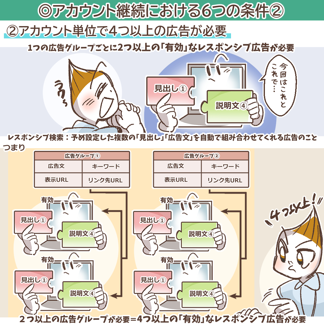 | アカウント単位で4つ以上の広告が必要 | 広告グループ毎に「有効」なレスポンシブ検索広告が2つ以上必要であるため、アカウント単位では計4つの広告が必要になる |