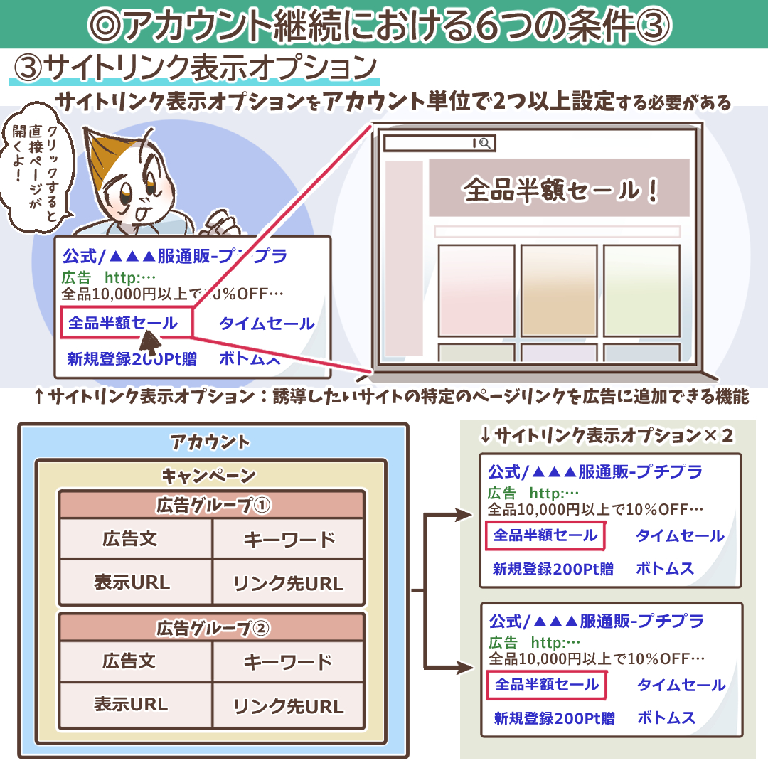 | サイトリンク表示オプション | 誘導したい特定のサイトページリンクを、アカウント単位で2つ以上設定が必要 |