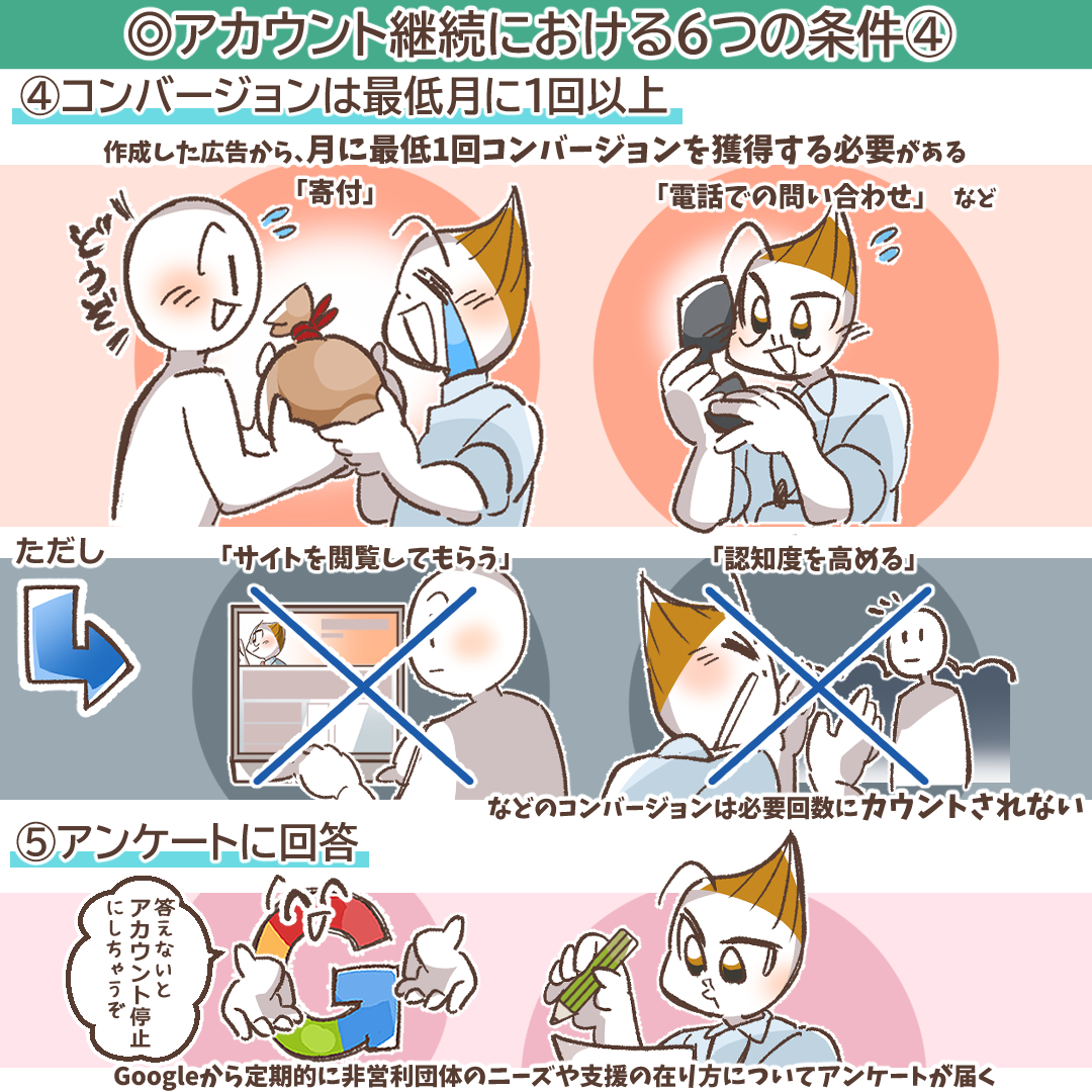 Google Ads Grants(グーグルアドグランツ)は上記の制限のほかに、アカウントを継続させるためにいくつかの条件があります。