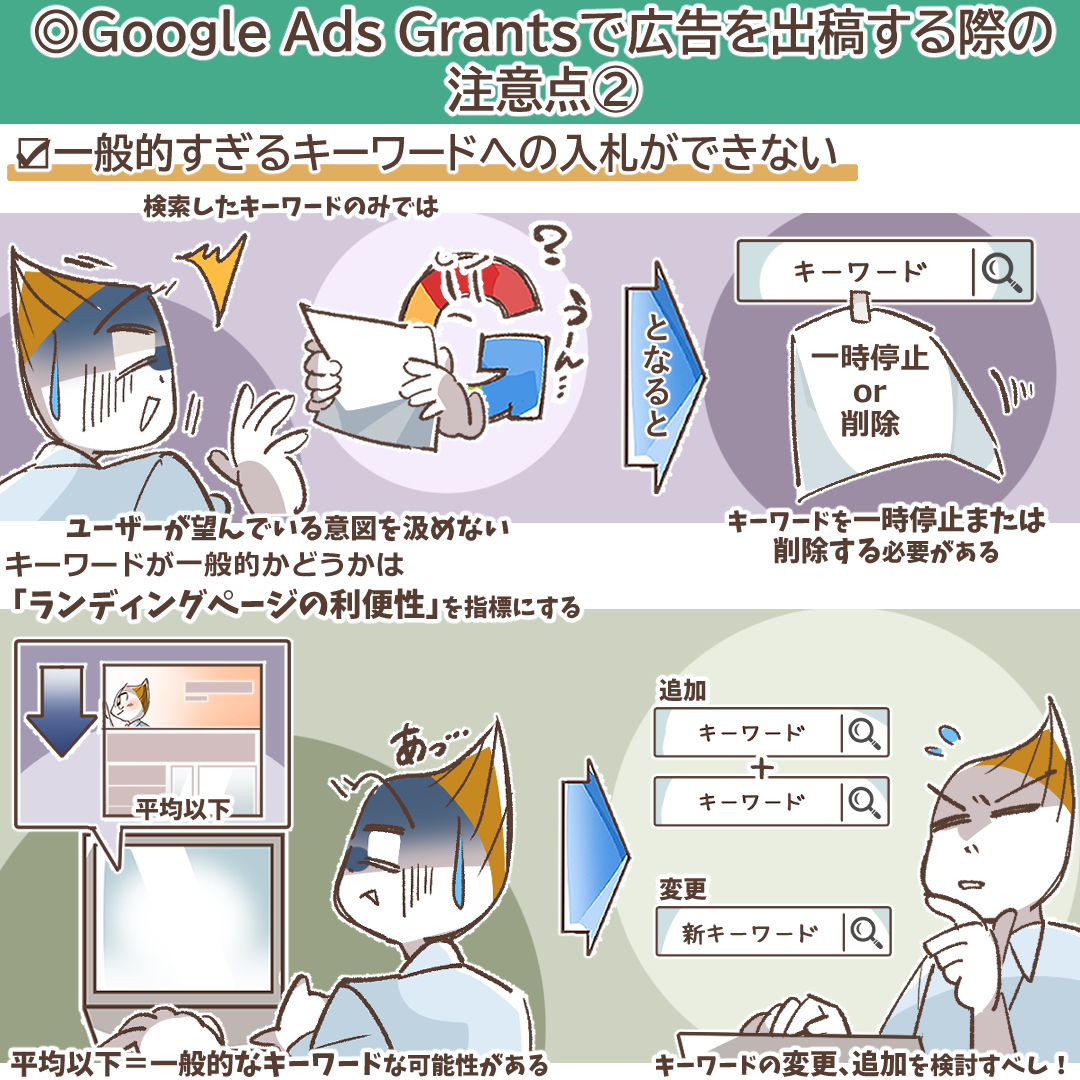 Google Ads Grantsの非営利活動に関するポリシーでは、検索したキーワードのみではユーザーが望んでいる意図を汲めない、一般的なキーワードの使用はできません。