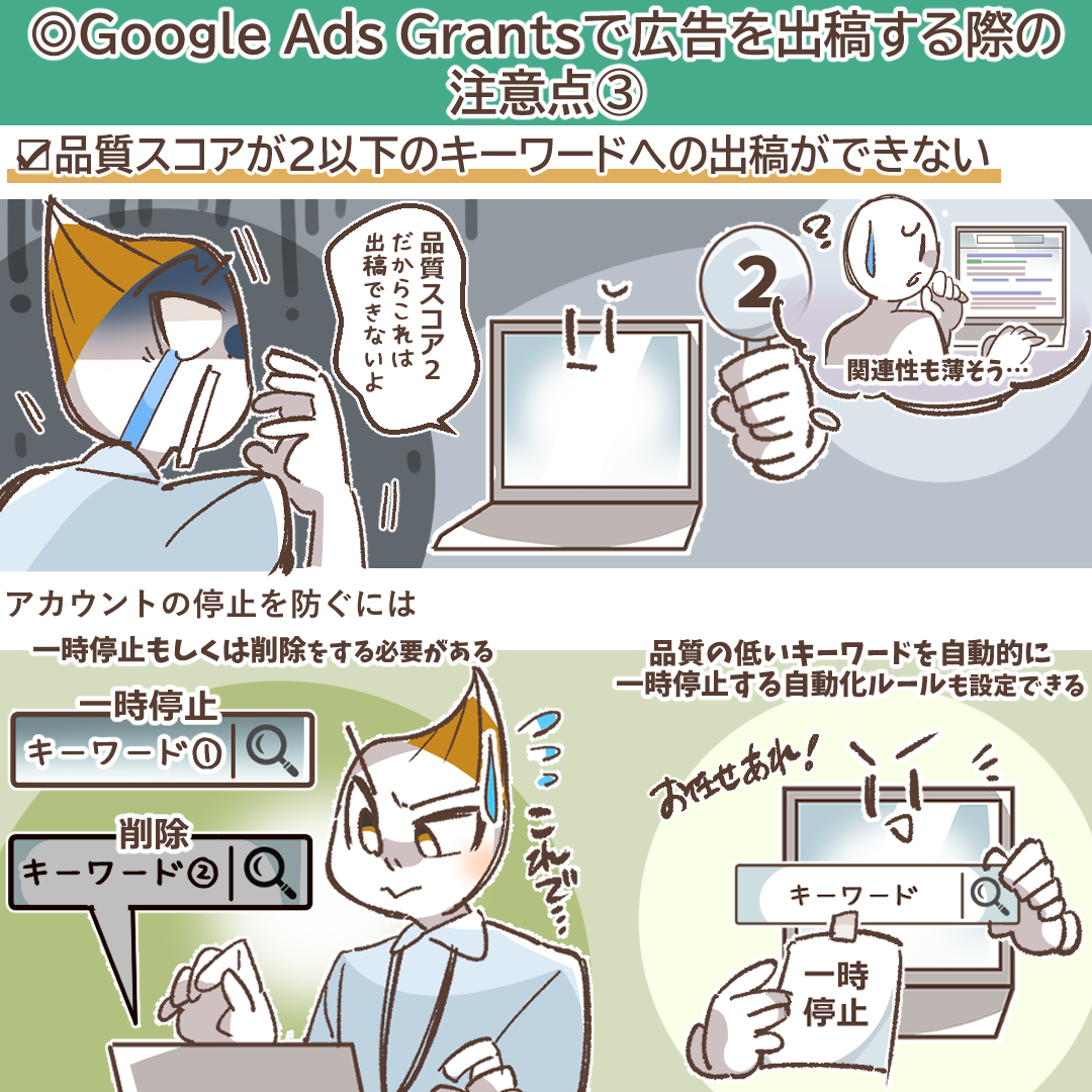 Google Ads Grantsの非営利活動に関するポリシーでは、品質スコアが2以下のキーワードは一時停止もしくは削除をする必要があります。