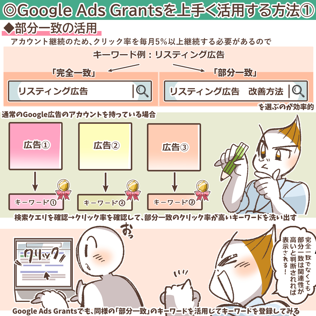そして収集した情報をもとにGoogle Ads Grantsのアカウントでも、同様の「部分一致」のキーワードを活用してキーワードを登録してみましょう。