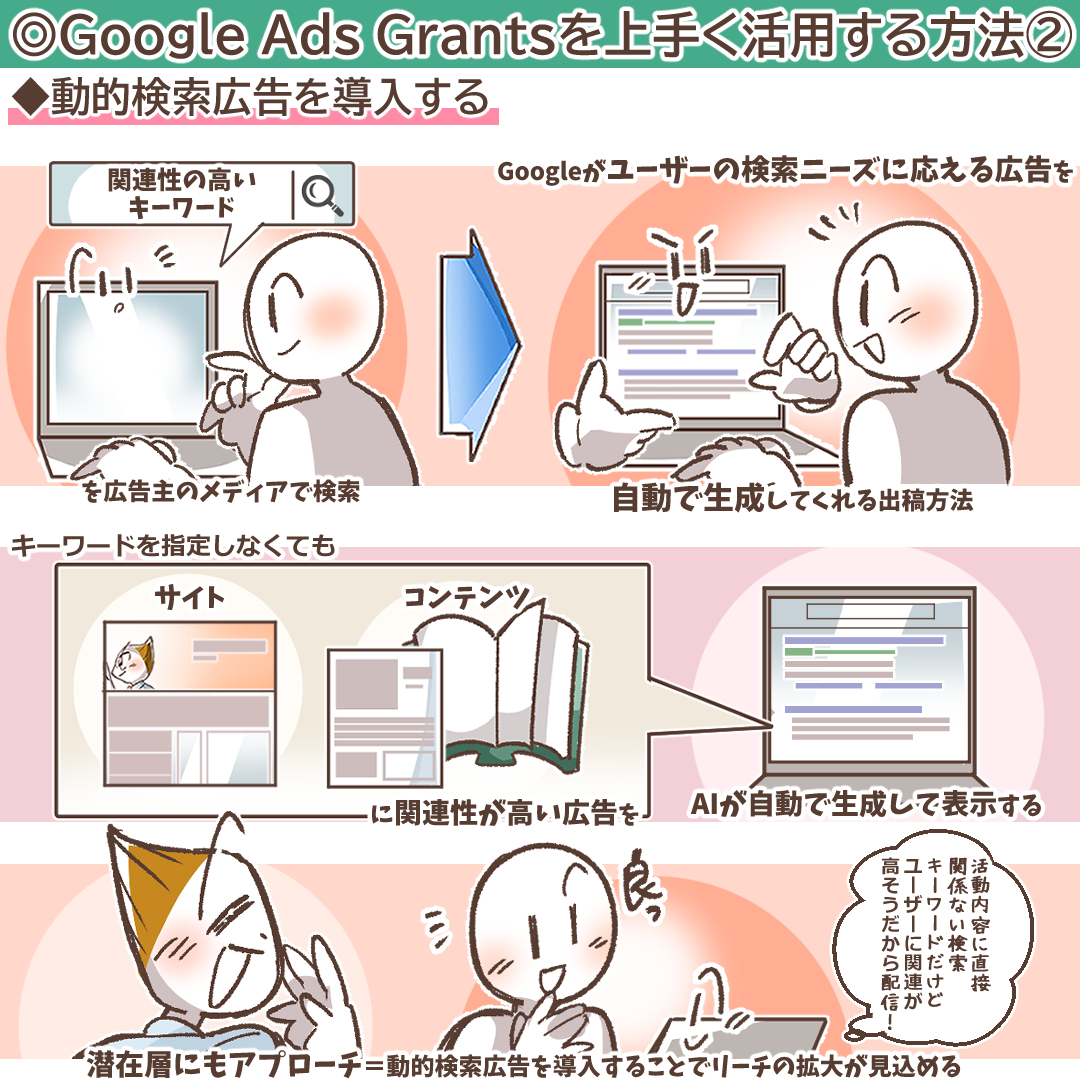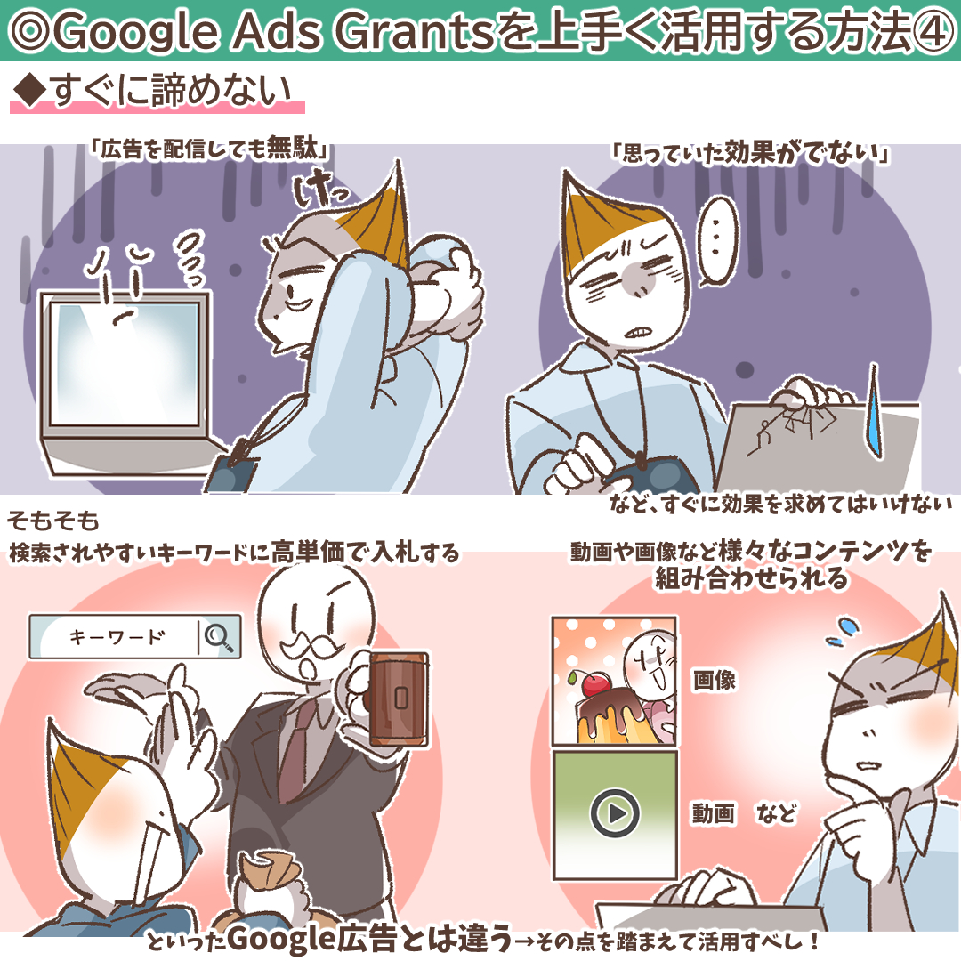 本来検索されやすいキーワードに高単価で入札したり、動画やさまざまなコンテンツを組み合わせたりできるGoogle広告と違います。その点を踏まえてGoogle Ads Grantsを活用しましょう。
