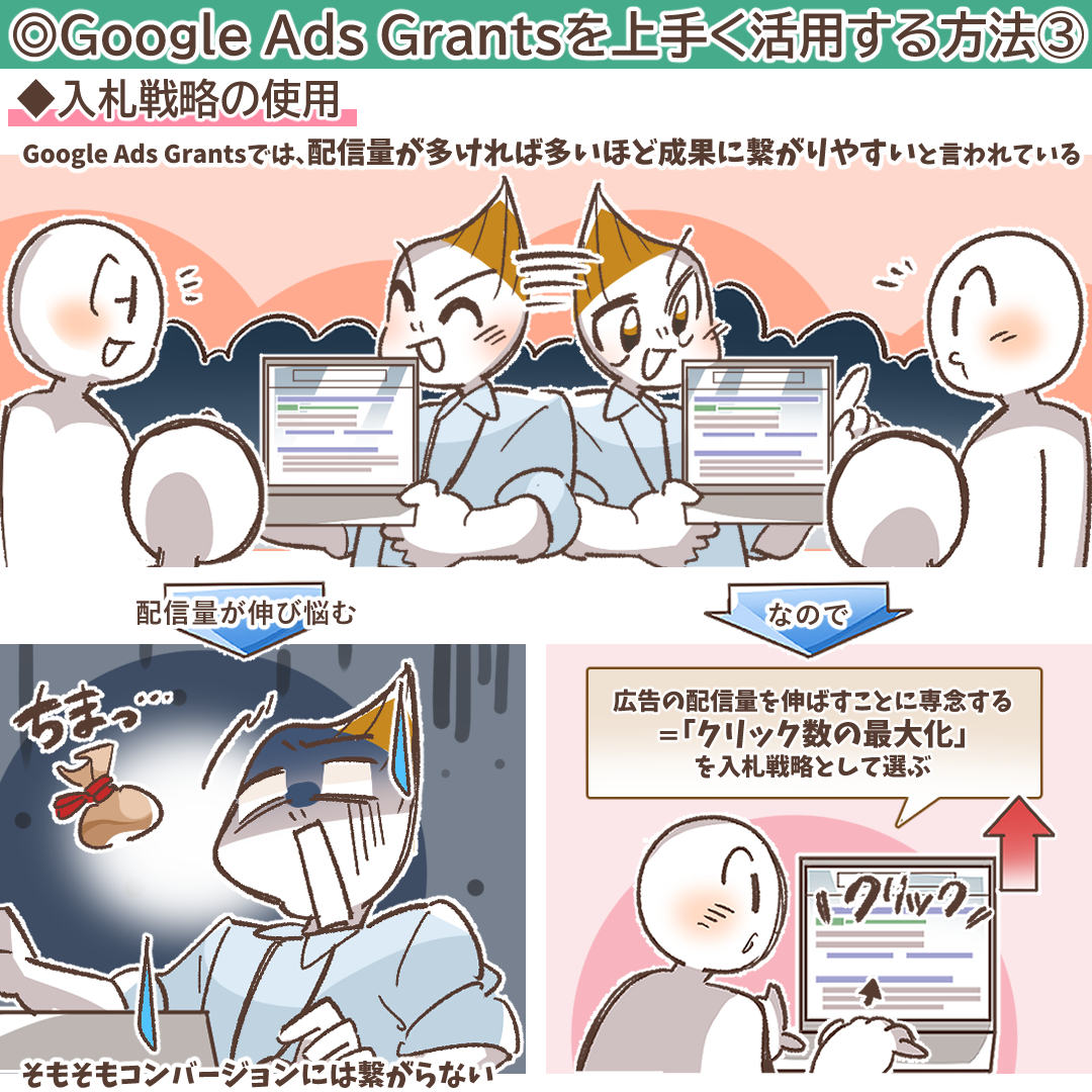 Google Ads Grants(グーグルアドグランツ)は一定額まで広告を無料で配信できるというメリットがありますが、さらに上手に活用するには以下の方法を試してみましょう。