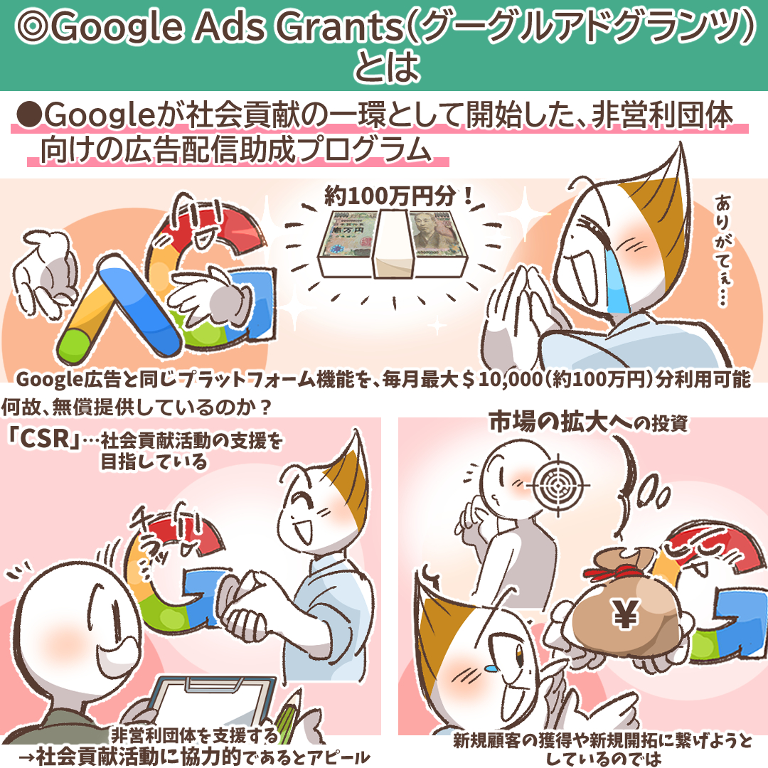 なぜGoogleが100万円分も無償で提供しているのか、理由のひとつは「CSR」いわゆる社会貢献活動の支援を目指しているためです。