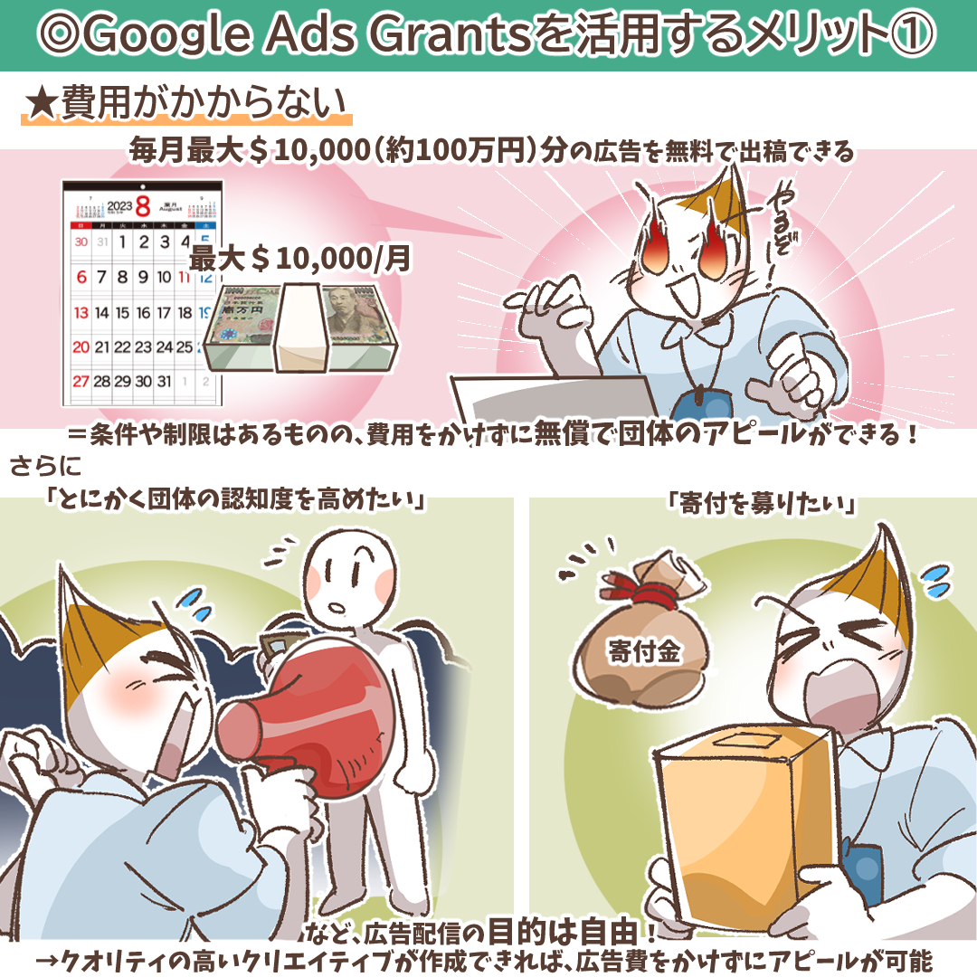 Google Ads Grantsは、毎月最大$10,000(約100万円)分の広告を無料で出稿できます。いくつかの条件や制限はあるものの、100万円の費用をかけずに、無償で団体のアピールができるというメリットがあります。