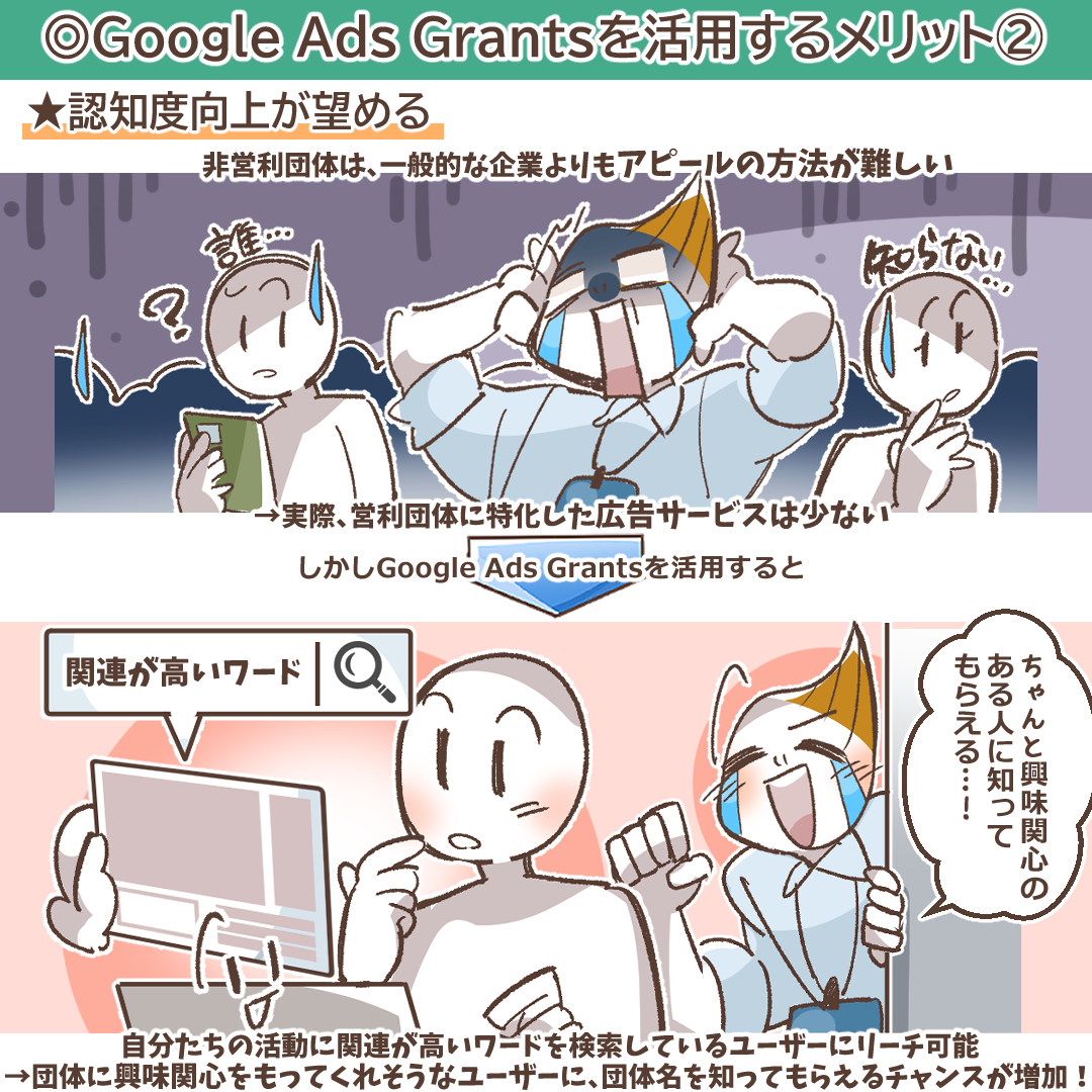 ただしGoogle Ads Grantsは参加条件やアカウント継続のためには、さまざまな条件を満たす必要があります。ゆえに「誰でも」活用できるわけではありませんが、条件にマッチしている団体にはサービスを活用して活動の推進が見込めるというメリットが多数あります。