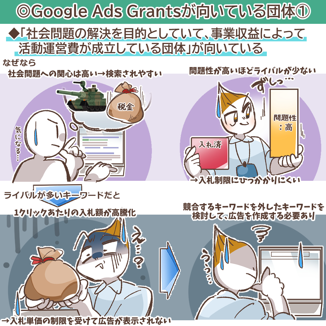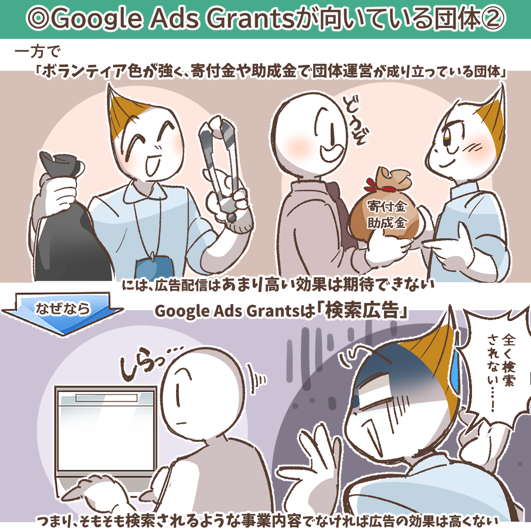 一方で「ボランティア色が強く、寄付金や助成金で団体運営が成り立っている団体」には、広告配信はあまり高い効果は期待できません。理由は、Google Ads Grantsは検索広告であるため、そもそも検索されるような事業内容でなければ広告の効果は高くないからです。