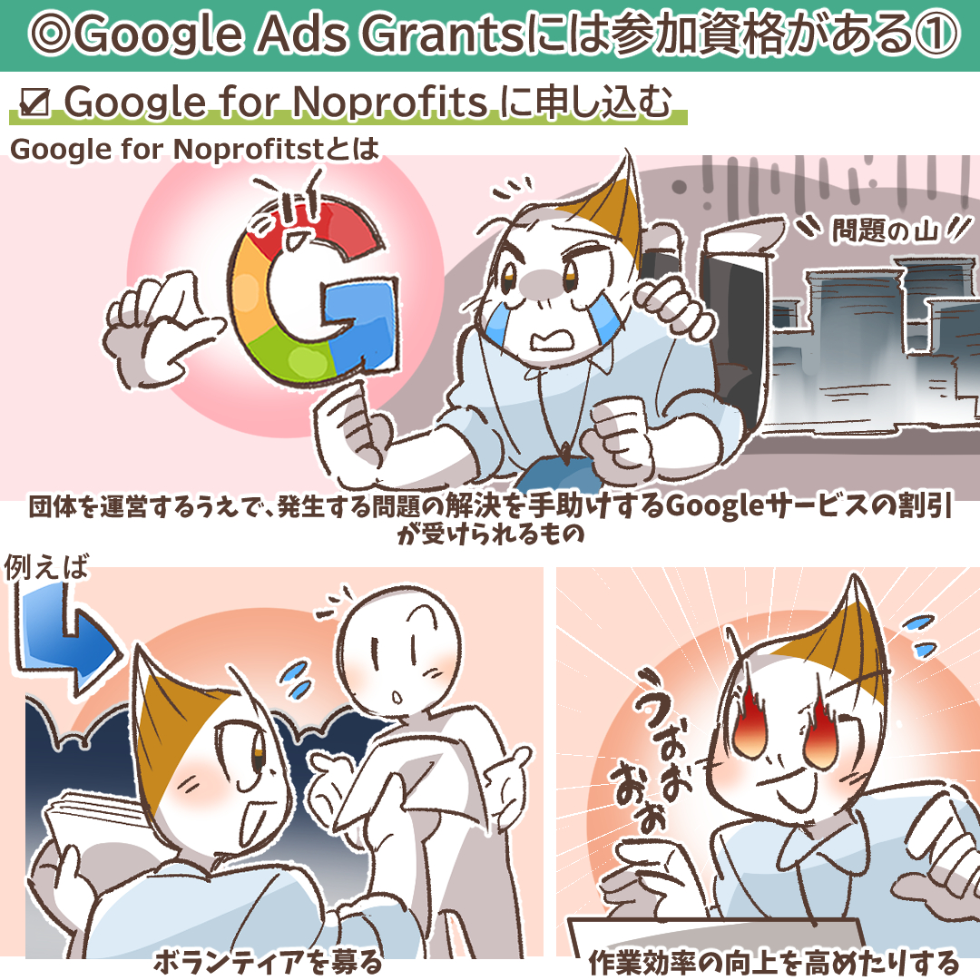 Google Ads Grantsでは、Google for Noprofitsに申し込みを済ませておく必要があります。