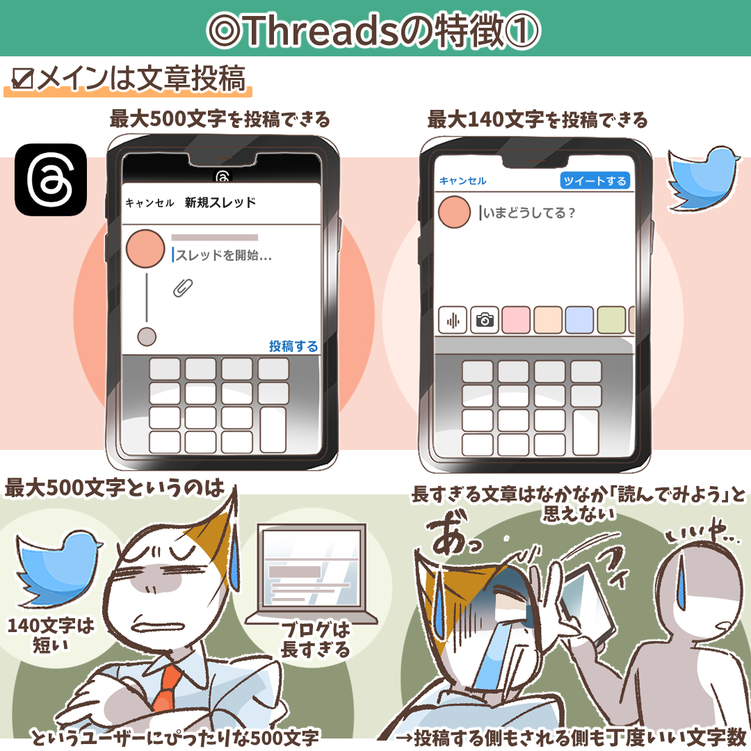 現在はTwitter(ツイッター)とThreads(スレッズ)で細かな使い勝手や使用感に違いがあり賛否の意見があるようですが、今後改良が進めばどんどんユーザーの満足度が上がっていくことが見込まれます。