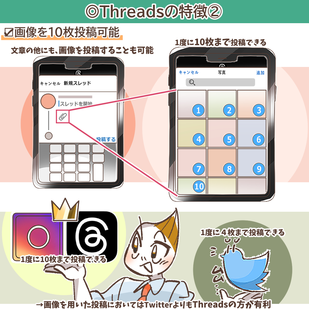 Twitter(ツイッター)では1度に4枚までしか投稿できないので、画像を用いた投稿においてはTwitter(ツイッター)よりもThreads(スレッズ)の方が、使い勝手において有利といえます。