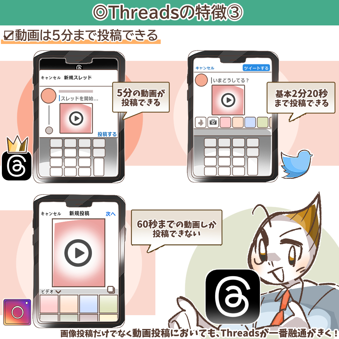 Twitter(ツイッター)の場合は基本2分20秒まで、Instagram(インスタグラム)では60秒までの動画しか投稿できません。画像投稿だけでなく動画投稿においても、Threads(スレッズ)が一番融通のきくSNSといえます。