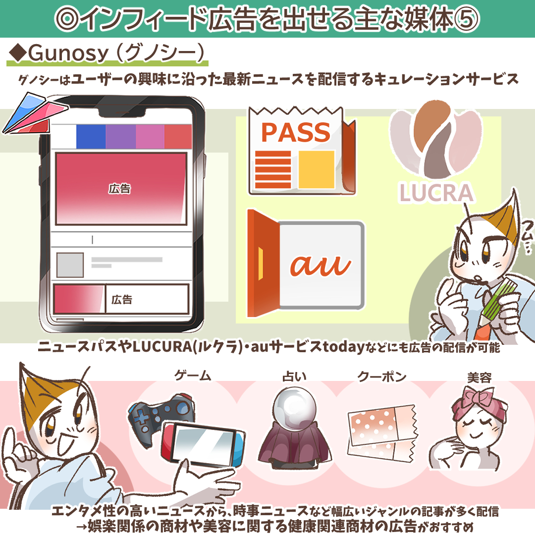 媒体概要と特徴:GunosyもSmartNewsと並ぶ代表的なニュースアプリで、ユーザーの興味関心に合わせて最適化されたニュースを配信するキュレーションサービスです。Gunosy本体のほか、女性向け情報アプリ「LUCRA(ルクラ)」や「ニュースパス」など、複数の提携アプリに広告を配信できます。