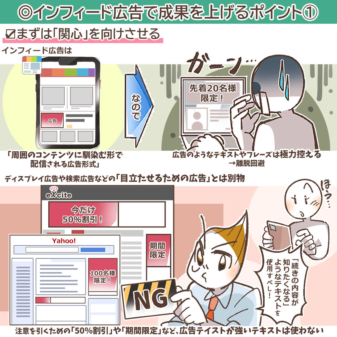 インフィード広告を運用する上で、まず最初に捨てるべき固定観念は、「広告は目立たせるべき」という考え方です。インフィード広告は、その本質において「周囲のコンテンツに馴染む」ことで価値を発揮する広告手法です。したがって、従来のバナー広告や検索広告のように、派手な色使いや大げさな文言でユーザーの「注意」を引こうとすると、かえって敬遠されてしまいます。