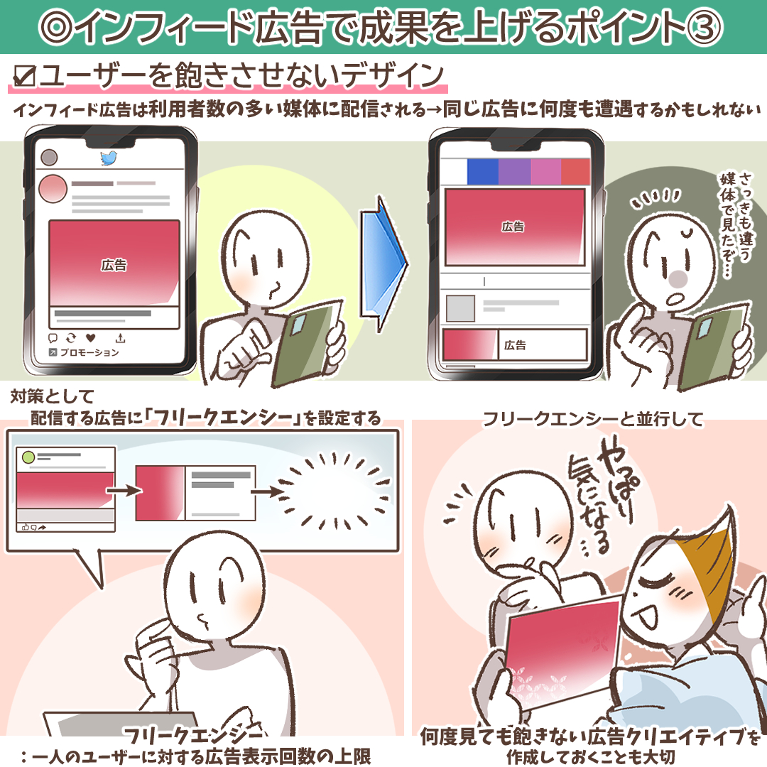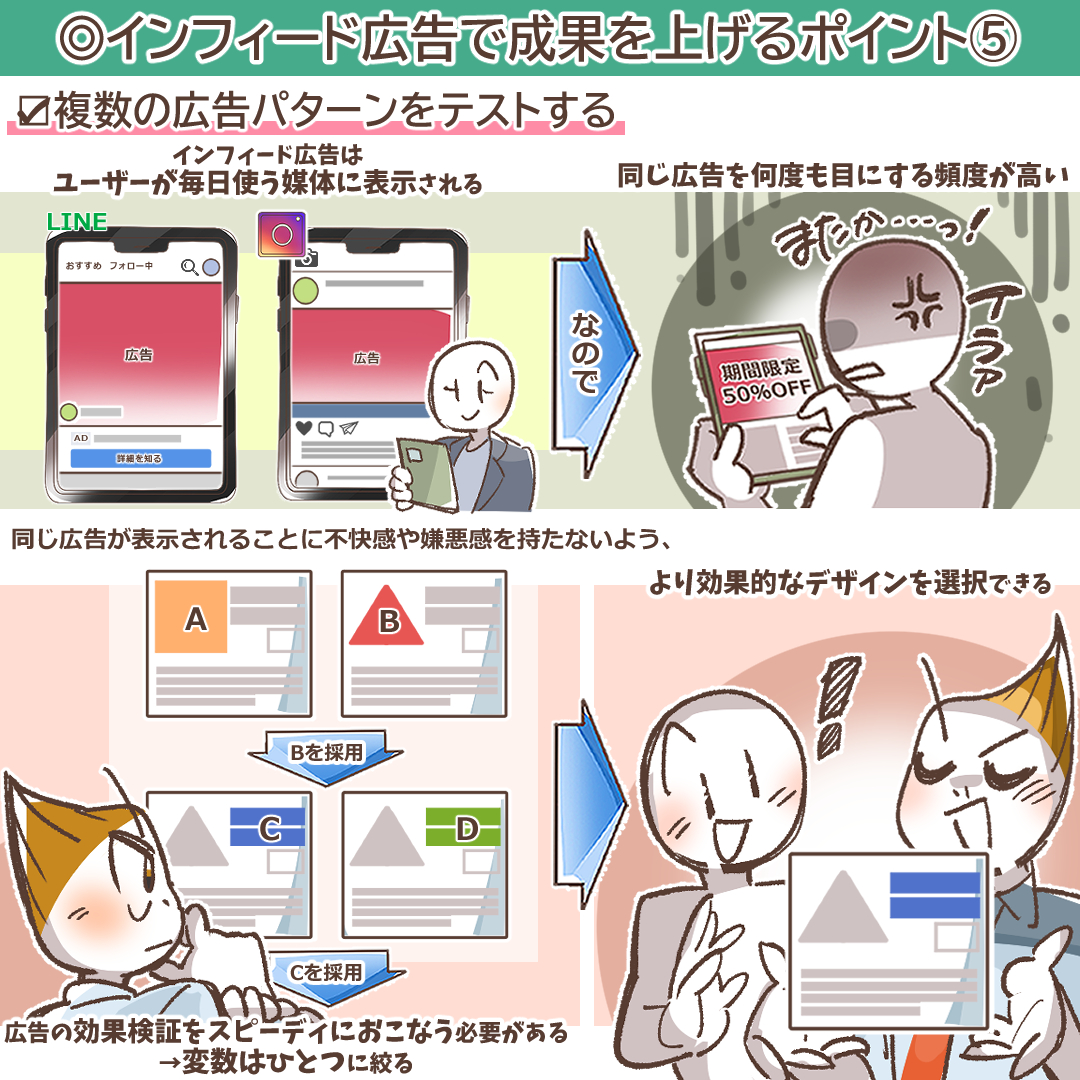 インフィード広告は、SNSやニュースアプリといったユーザーが毎日高頻度で利用する媒体に表示されるため、同じ広告が何度も表示されると、すぐに飽きられてしまい、効果が低下していきます。これを「広告疲弊(Ad Fatigue)」と呼びます。この広告疲弊を防ぎ、常に高いパフォーマンスを維持するためには、絶えず新しい広告クリエイティブを投入し、効果検証をスピーディに行う運用体制が不可欠です。