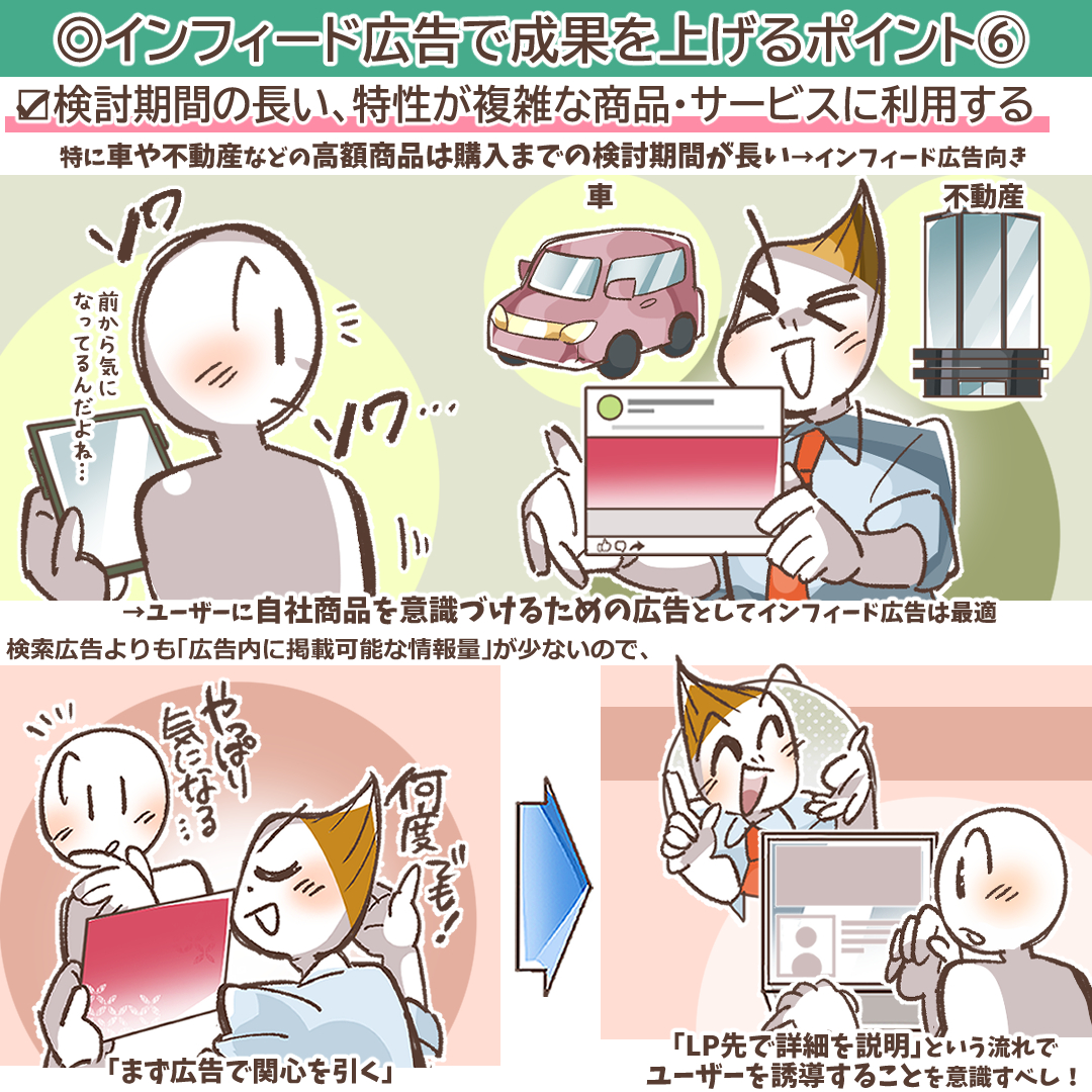 これらの商材では、ユーザーは一度広告をクリックしただけですぐに購入を決断することはありません。複数の競合他社と比較検討し、じっくりと考えた上で意思決定を行います。インフィード広告の役割は、この長い検討期間中に、ユーザーの頭の中から自社の商品やサービスの存在を忘れさせないように、継続的に接触を図り、意識づけを行うことです。