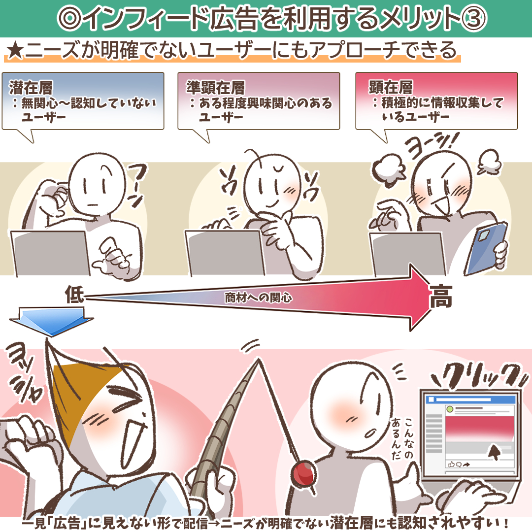三つ目のメリットは、メリット2とも関連しますが、ニーズがまだ明確になっていない「潜在層」に効果的にアプローチできる点です。マーケティングにおける顧客の関心度は、一般的に以下の3つの階層に分けられます。