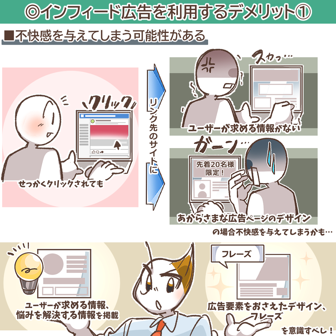 インフィード広告の最大の強みは、ユーザーに「これは面白そうなコンテンツかもしれない」と期待させてクリックを促す点にあります。しかし、この「期待」を裏切った時の反動は、他の広告よりも大きくなる可能性があります。クリックして遷移した先のランディングページ(LP)が、広告クリエイティブから受けた印象と大きくかけ離れていたり、あからさまな広告要素が満載だったりした場合、ユーザーは「騙された」と感じ、強い不快感を抱いてしまいます。