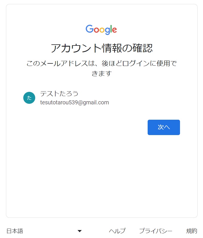 ⑩アカウント情報の確認画面が表示されます。問題なければ「次へ」をクリック