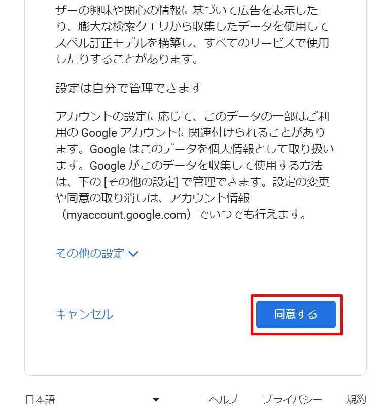 ⑪プライバシーと利用規約が表示されますので内容を確認し、最後に「同意する」をクリックすればアカウント作成完了です。
