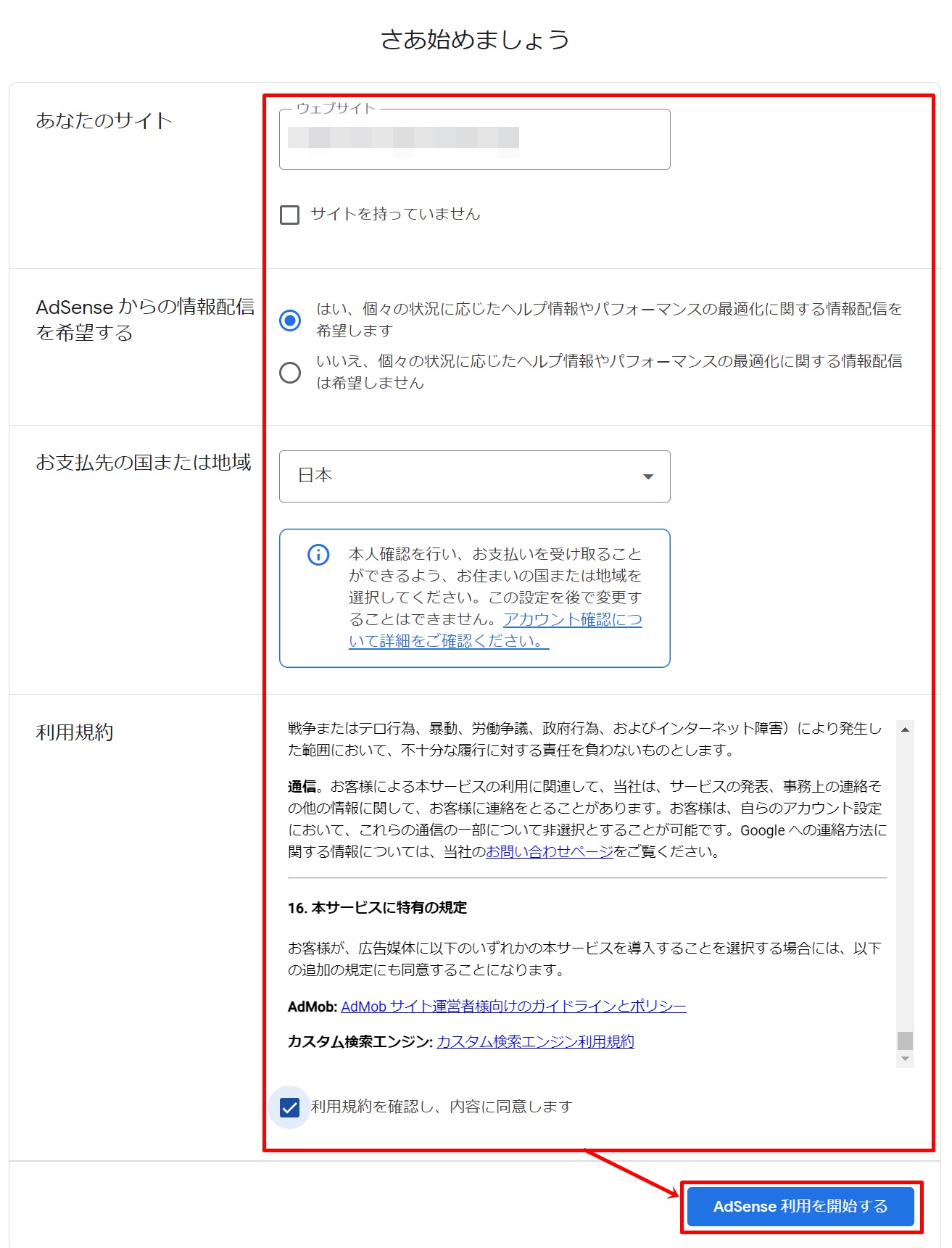 審査対象のサイトURLを入力し、アドセンスの情報を受け取る・受け取らないの選択をします。