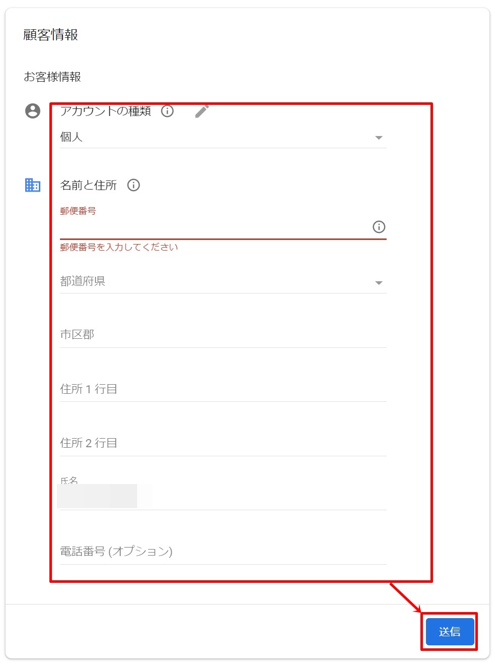 住所と氏名を入力し送信します。この住所はGoogleアドセンスの報酬が発生した際受け取るために必要なので、正しい住所を入力しましょう。