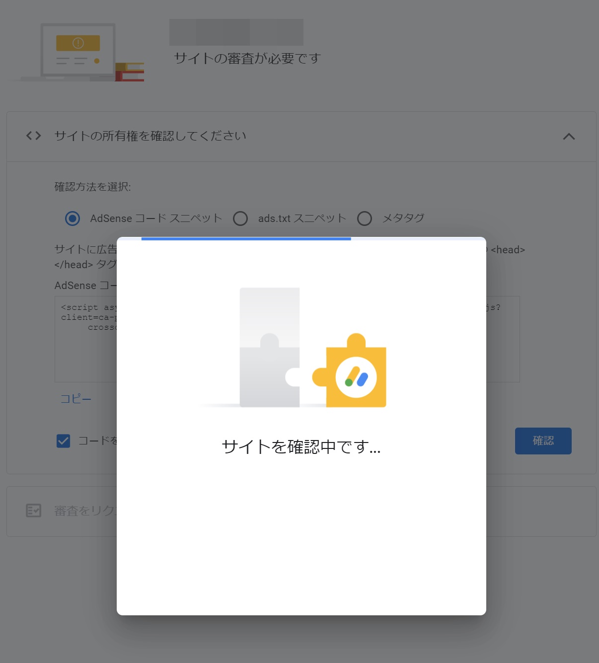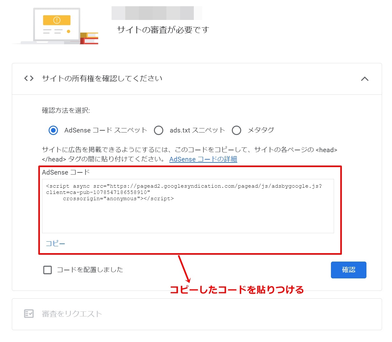 コードを貼り付けたらGoogleアドセンスのページに戻り、「サイトにコードを貼り付けた」にチェックを入れます。