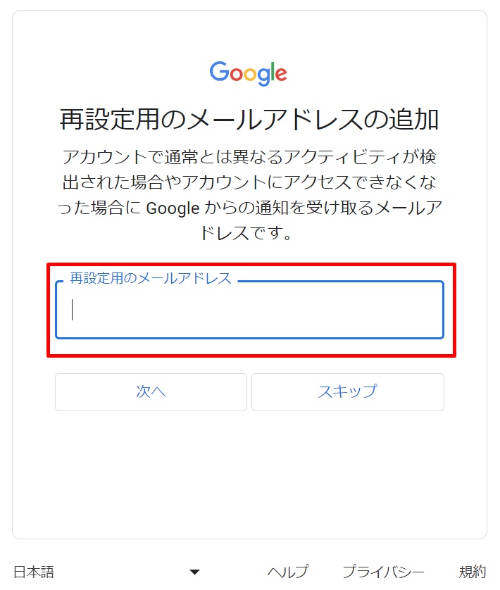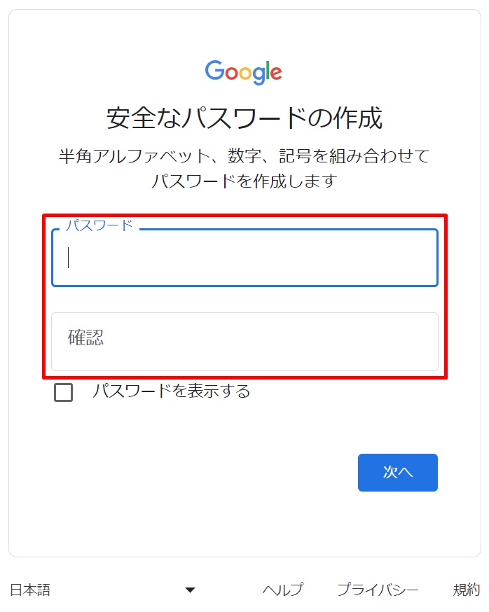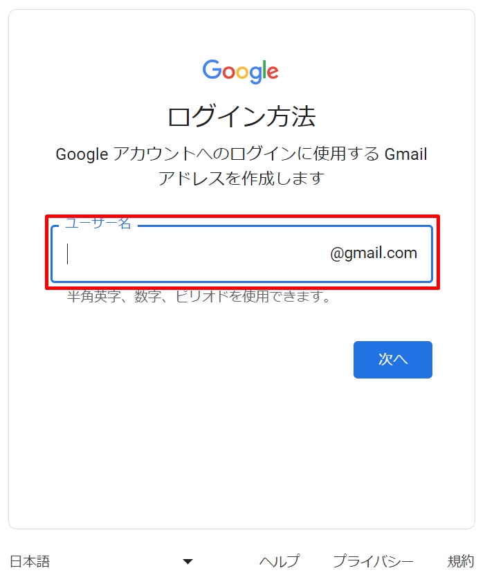 ⑥GoogleアカウントにはGmailが必要となるため、Gmailのアドレスを入力し新規作成します。