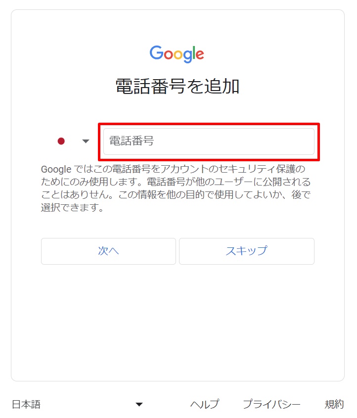 ⑨セキュリティ保護のため、電話番号を入力する画面に移ります。この項目はスキップすることも可能です。