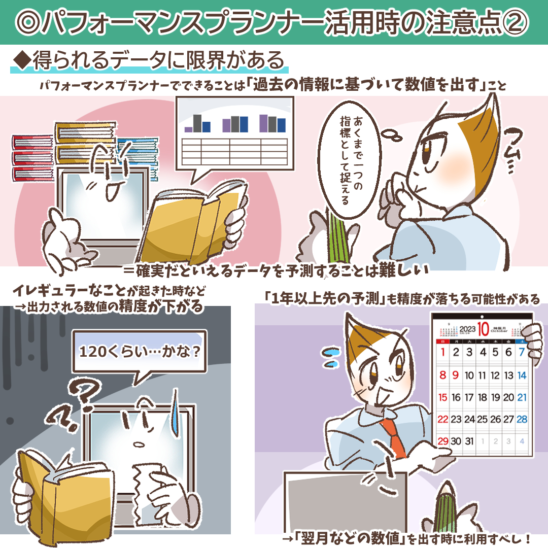 そのほか、「1年以上先の予測」も精度が落ちる可能性があるため、パフォーマンスプランナーで予測するのは「翌月などの数値」を出す時に利用しましょう。