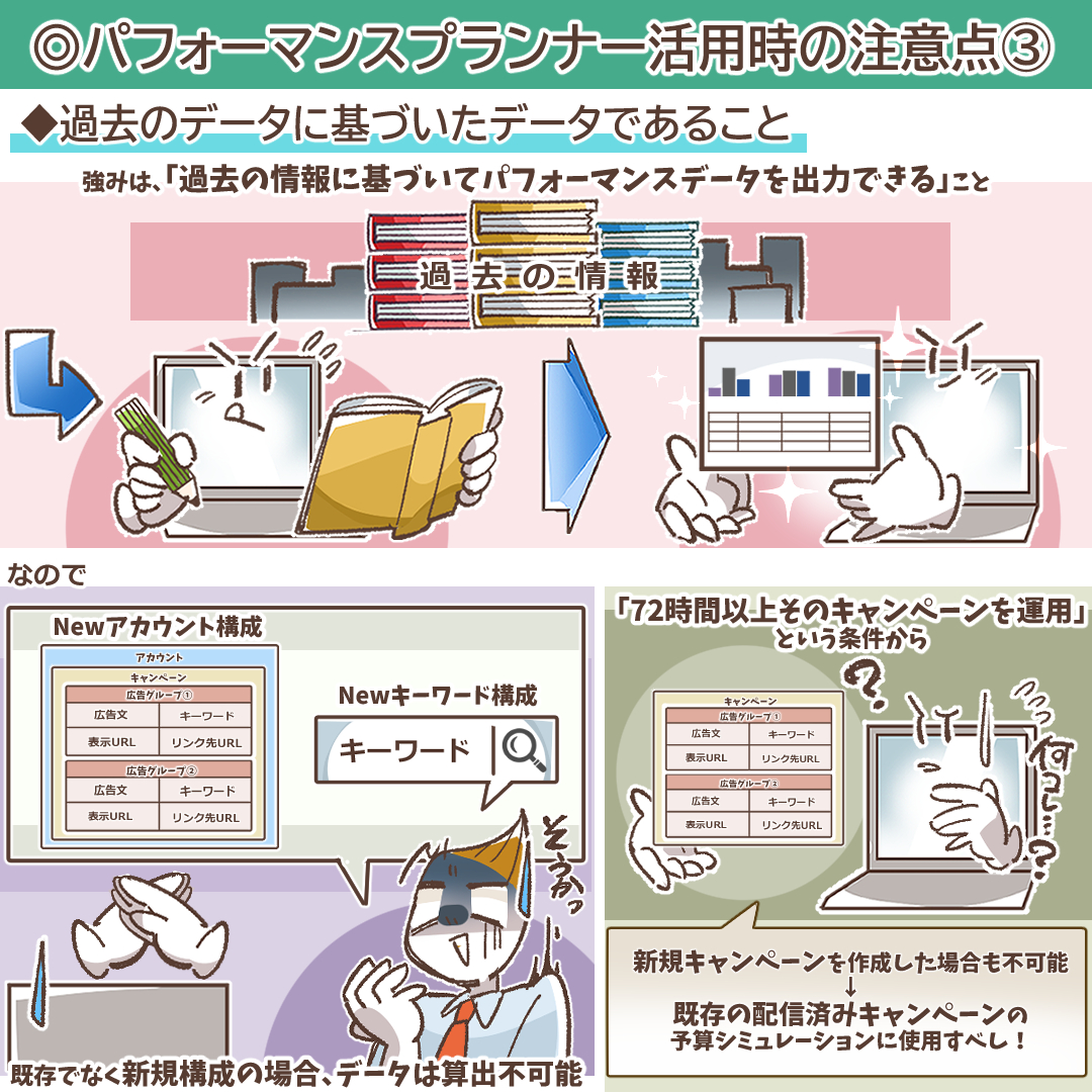 また、後述する「72時間以上そのキャンペーンを運用」という条件から、新規キャンペーンを作成した場合も、パフォーマンスプランナーでシミュレーションすることは不可能です。