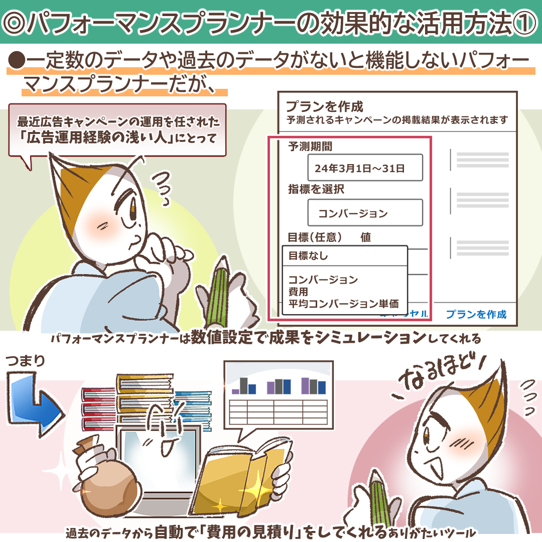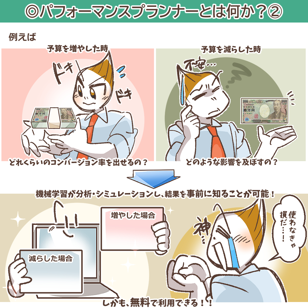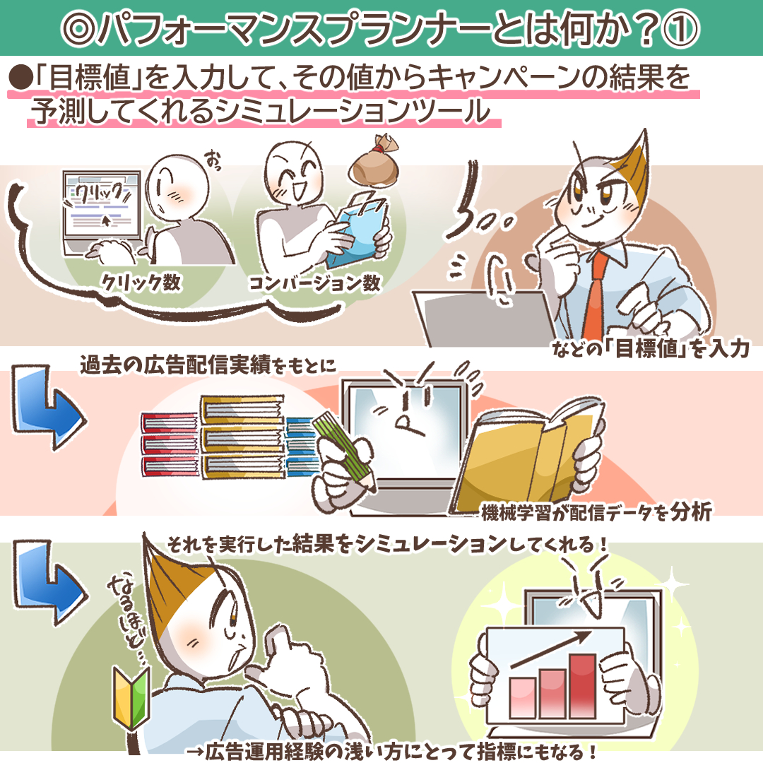 特に、最近になって広告キャンペーンの運用を任された「広告運用経験の浅い人」にとって、数値設定で成果をシミュレーションしてくれるパフォーマンスプランナーは過去のデータから自動で「費用の見積り」をしてくれるありがたいツールになります。