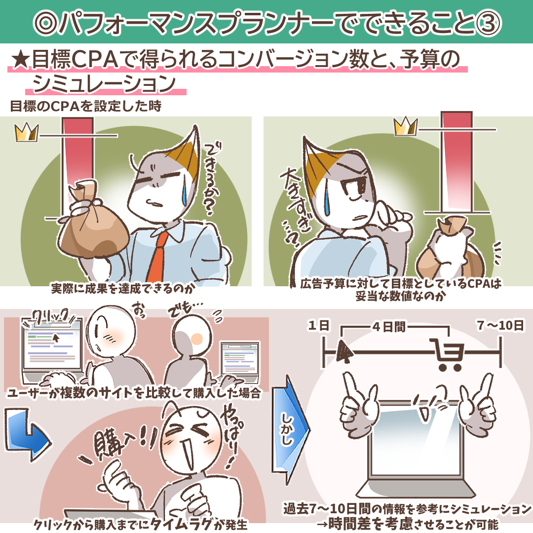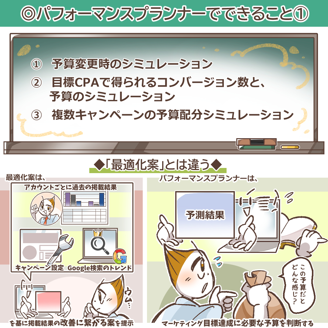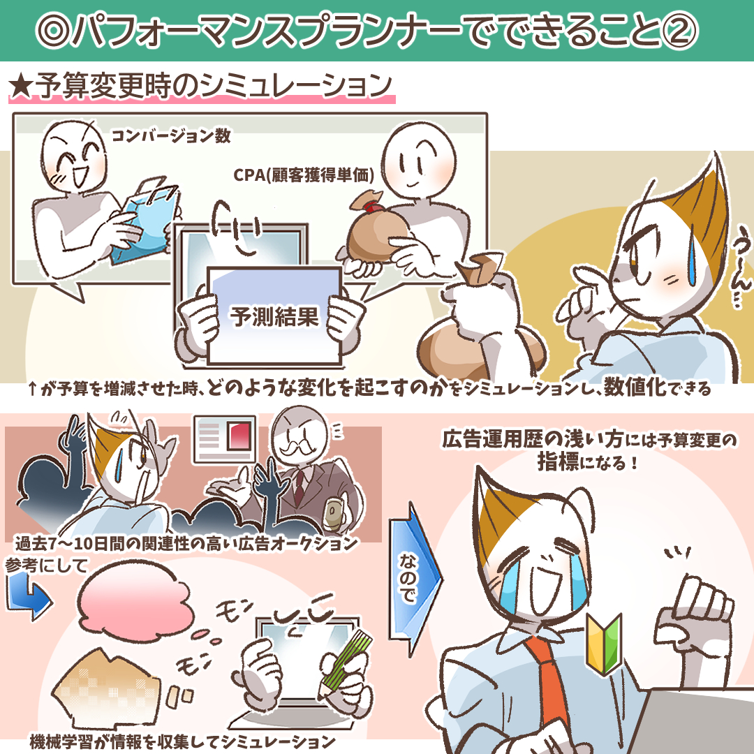 特に、最近になって広告キャンペーンの運用を任された「広告運用経験の浅い人」にとって、数値設定で成果をシミュレーションしてくれるパフォーマンスプランナーは過去のデータから自動で「費用の見積り」をしてくれるありがたいツールになります。