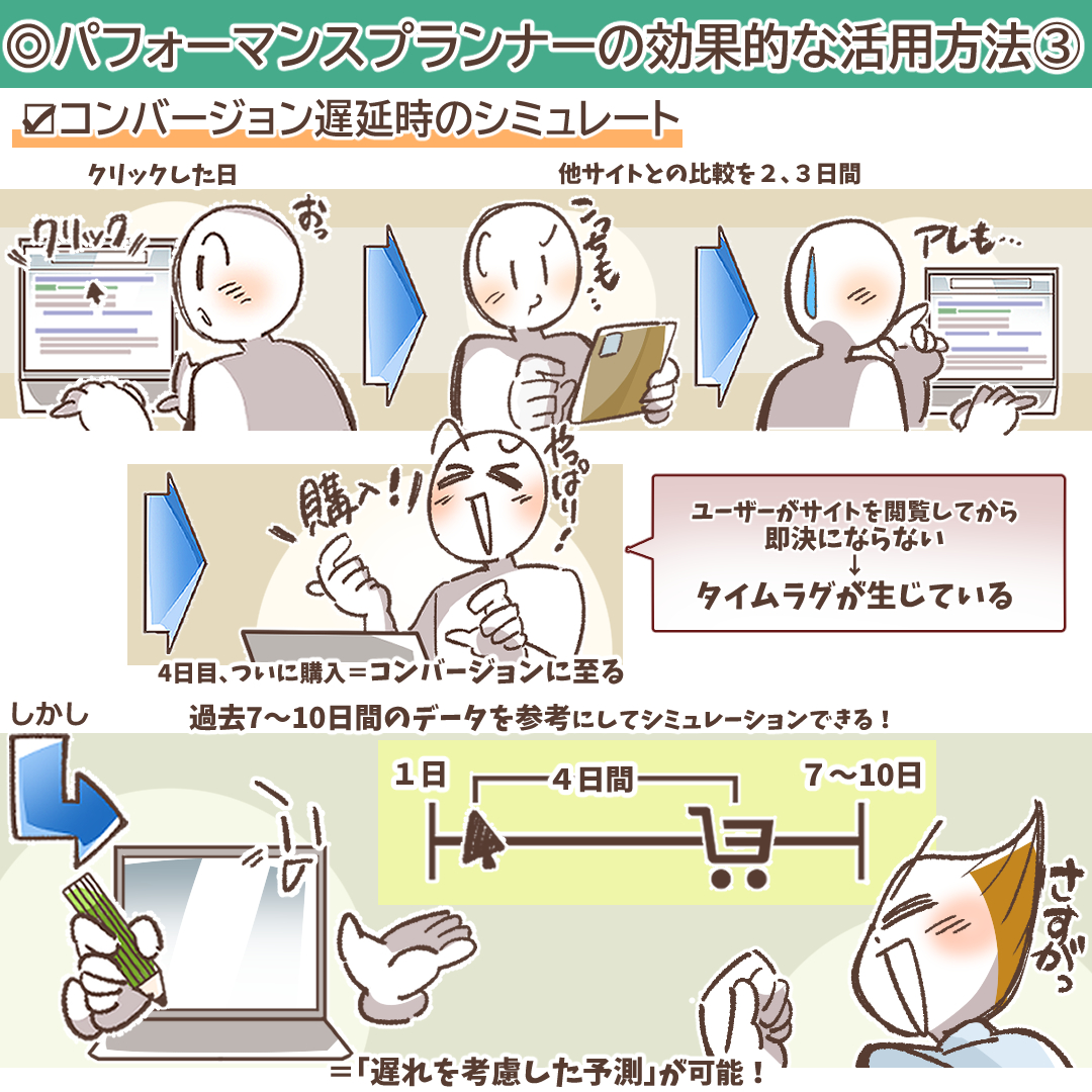ユーザーがサイトを閲覧してから即決にならない場合も、パフォーマンスプランナーなら「遅れを考慮した予測」が可能です。