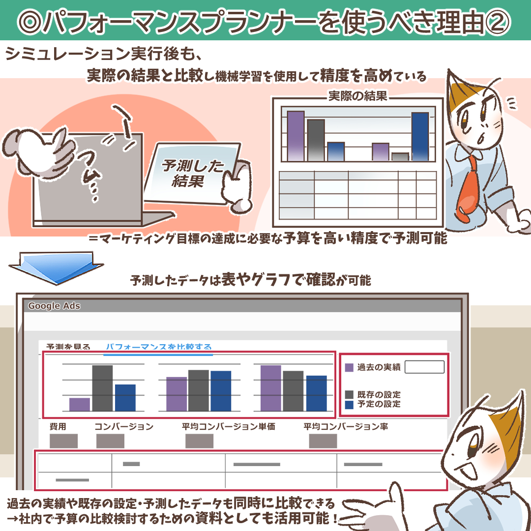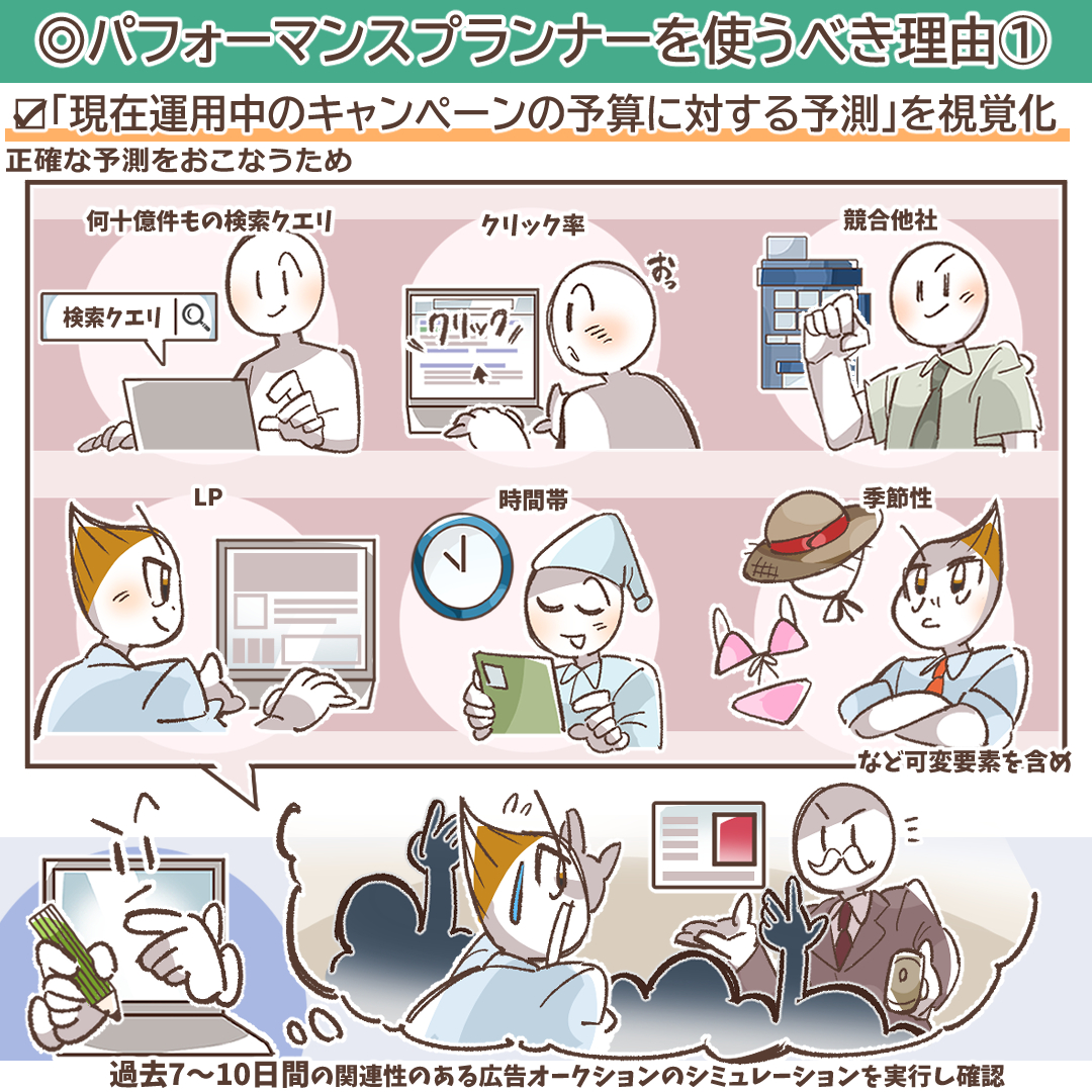 パフォーマンスプランナーを使うべき理由は、「現在運用中のキャンペーンの予算に対する予測」を視覚化できるということです。