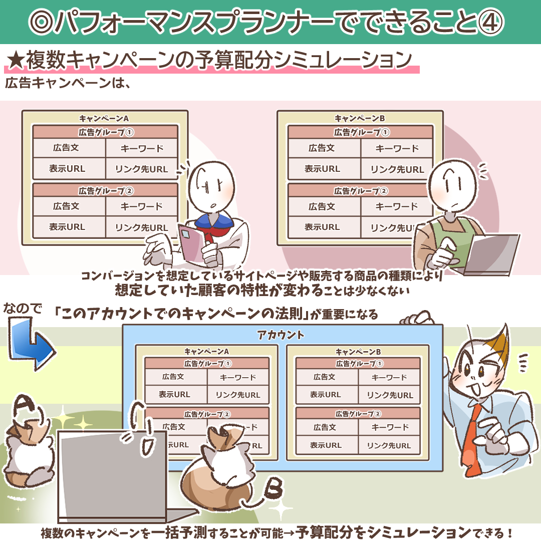 パフォーマンスプランナーは、運営している複数のキャンペーンをまとめてシミュレーションできます。