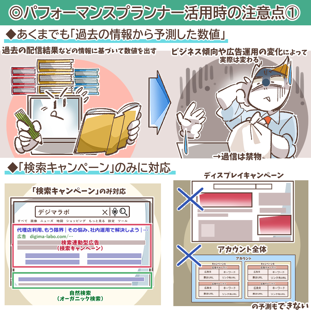 ディスプレイキャンペーンを含め、アカウント全体の予測もできないので、注意してください。