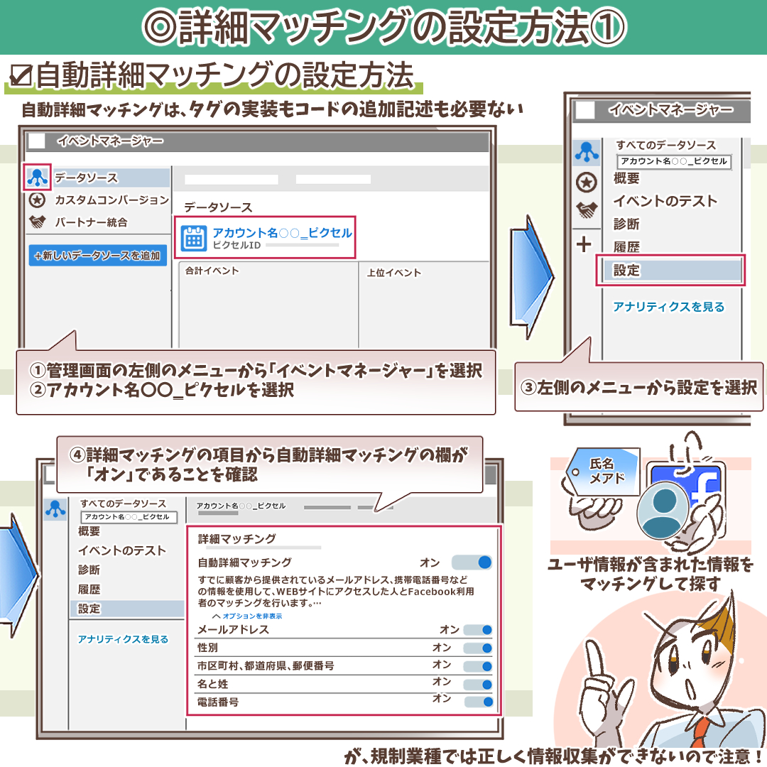 自動詳細マッチングの設定は非常に簡単で、コードの編集は一切不要です。Meta広告マネージャの関連ツールである「イベントマネージャ」から数クリックで完了します。