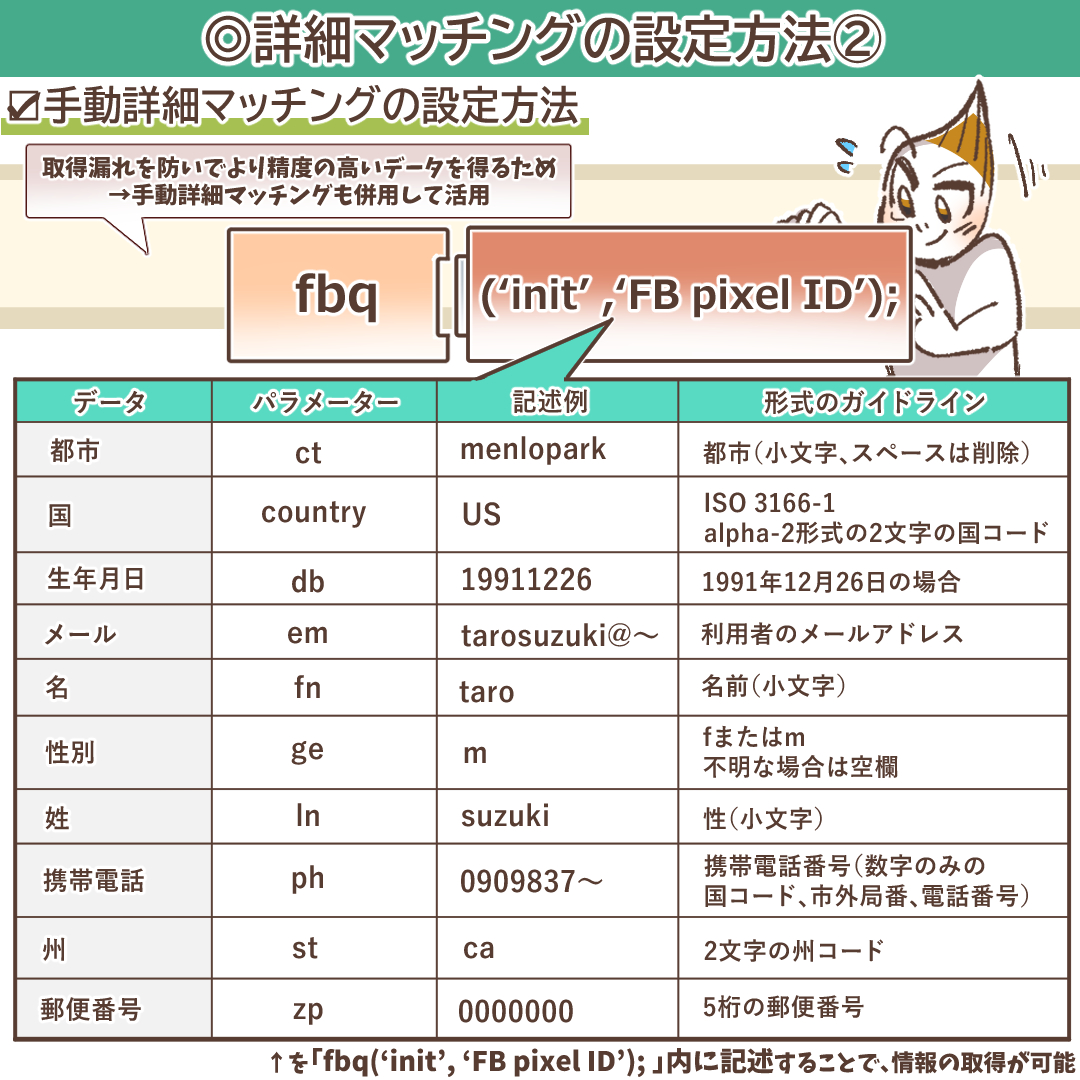 手動詳細マッチングは、広告主が自らウェブサイトのソースコード(Metaピクセルコード)を修正し、どの顧客情報をMetaに送信するかを明示的に指定する方法です。自動詳細マッチングが「推測」でデータを取得するのに対し、手動詳細マッチングは「確実」にデータを送信するため、より高い精度と信頼性を誇ります。自動詳細マッチングでは取得できない情報を補完し、マッチングの機会損失を防ぐために不可欠な手法です。