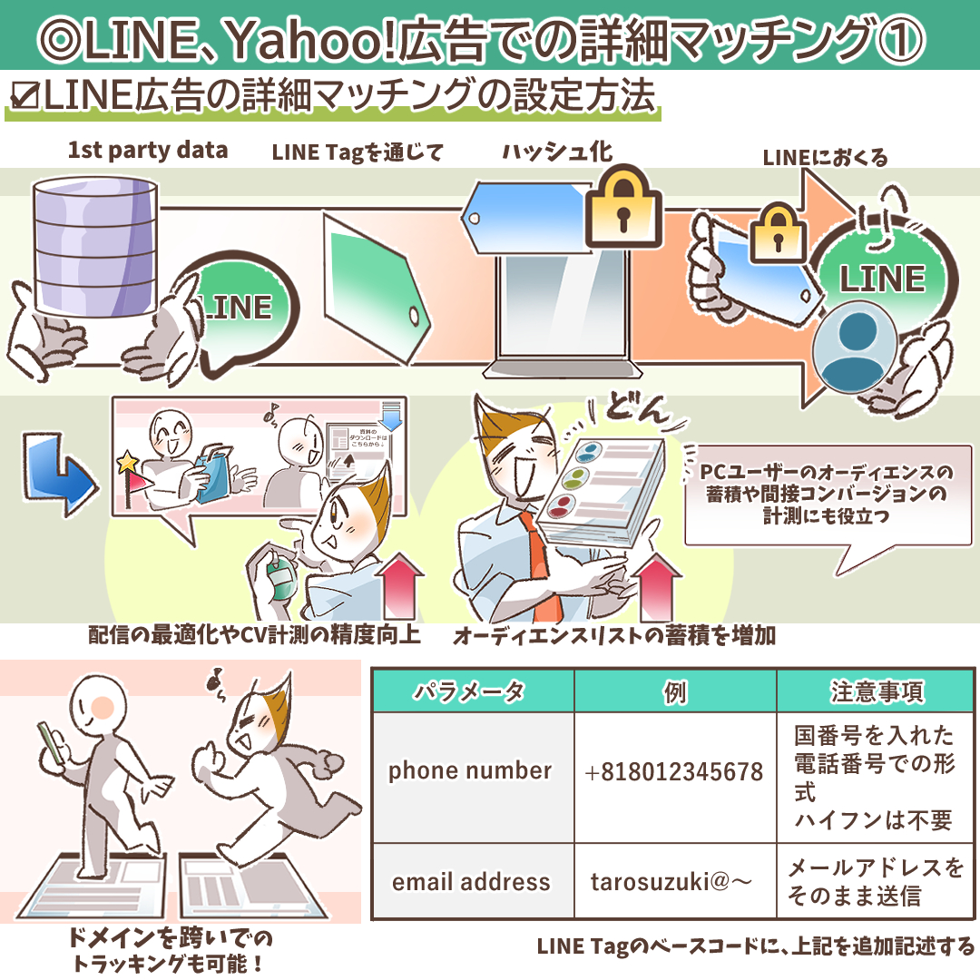 顧客情報を活用したコンバージョン計測の精度向上は、Meta広告に限った話ではありません。他の主要な広告プラットフォームも同様の機能を提供しています。ここでは、LINE広告とYahoo!広告における詳細マッチング機能について解説します。