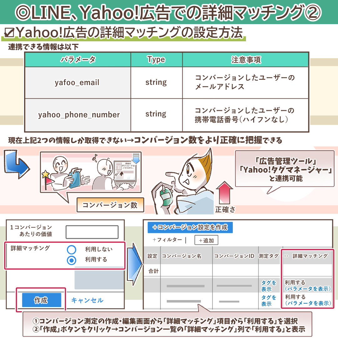 Yahoo!広告の詳細マッチングは、まず広告管理ツールで設定を有効にし、その後、サイトに設置するコンバージョン測定タグにパラメータを追加します。