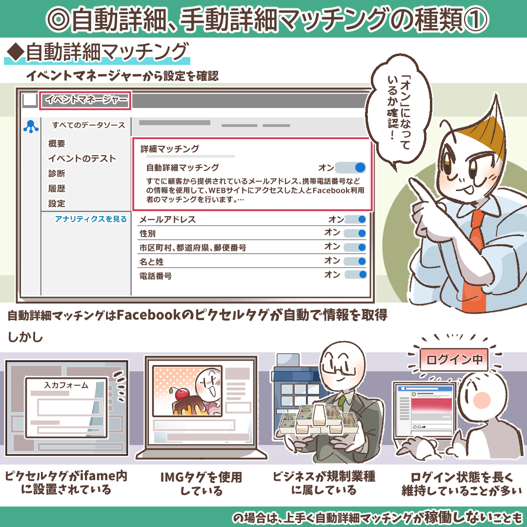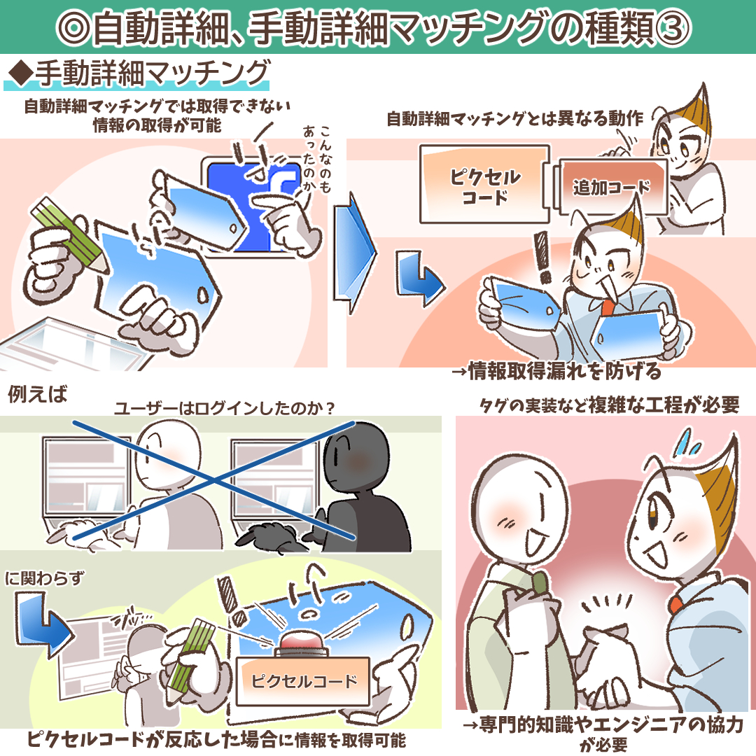 - 解決策A: 手動詳細マッチングを実装し、メールアドレスや電話番号に加えて、氏名や住所など、送信できるパラメータの種類を増やすことを検討します。