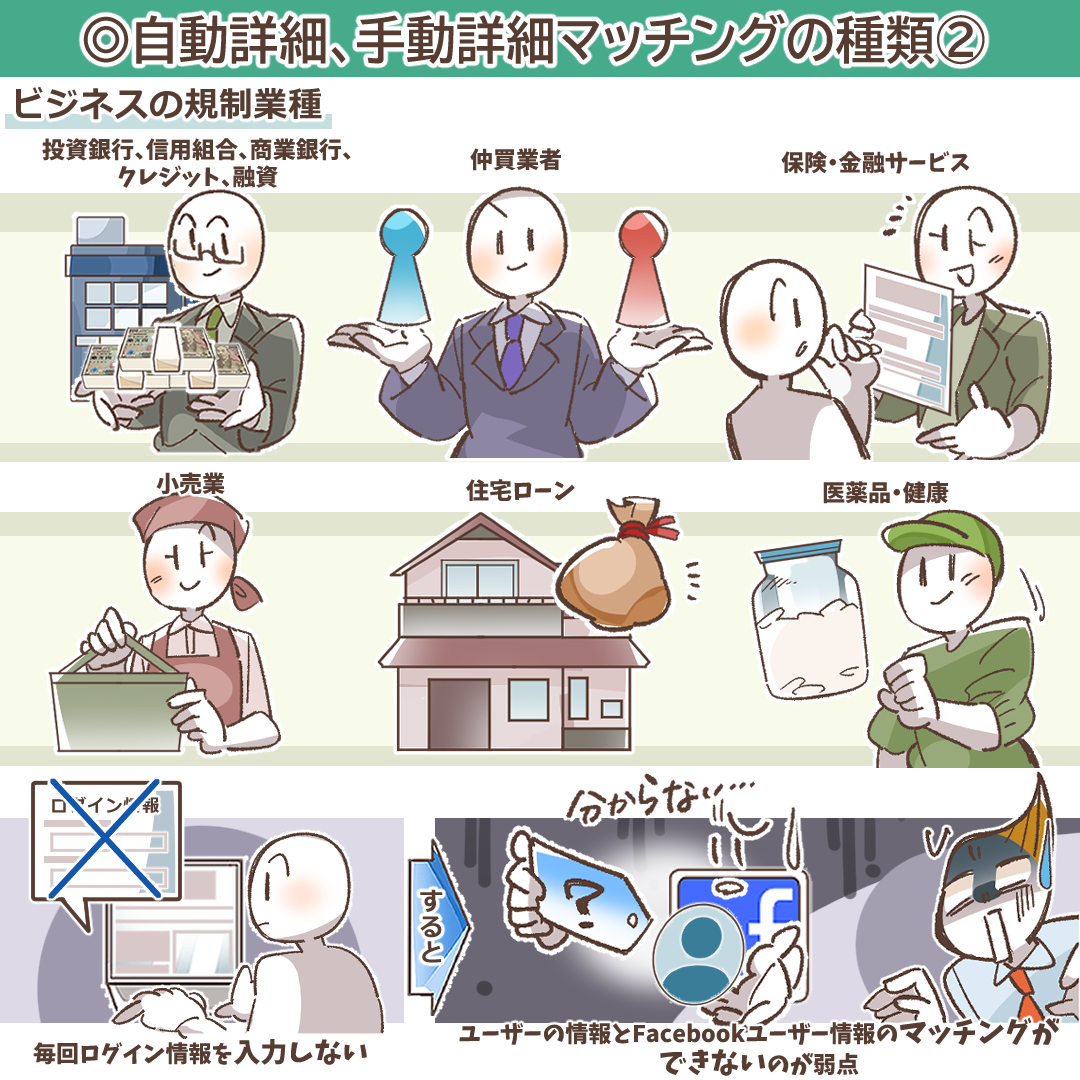- 規制業種に該当するビジネス: Metaは、特に機微な個人情報を取り扱う一部の業種において、自動詳細マッチングの利用を制限しています。これには、金融サービス(投資銀行、保険、ローン、クレジットなど)、医療・医薬品関連のビジネスが含まれます。これらの業種では、より明示的な同意と制御が可能な手動詳細マッチングの利用が必須となります。