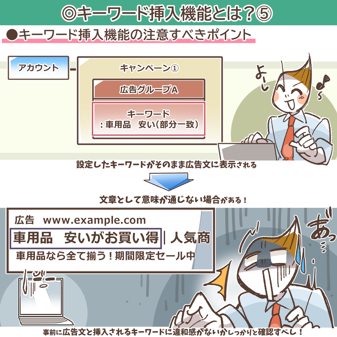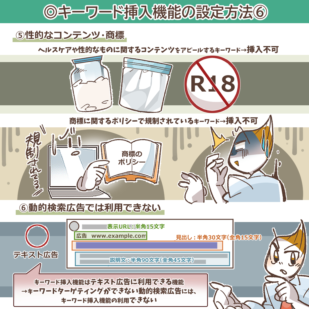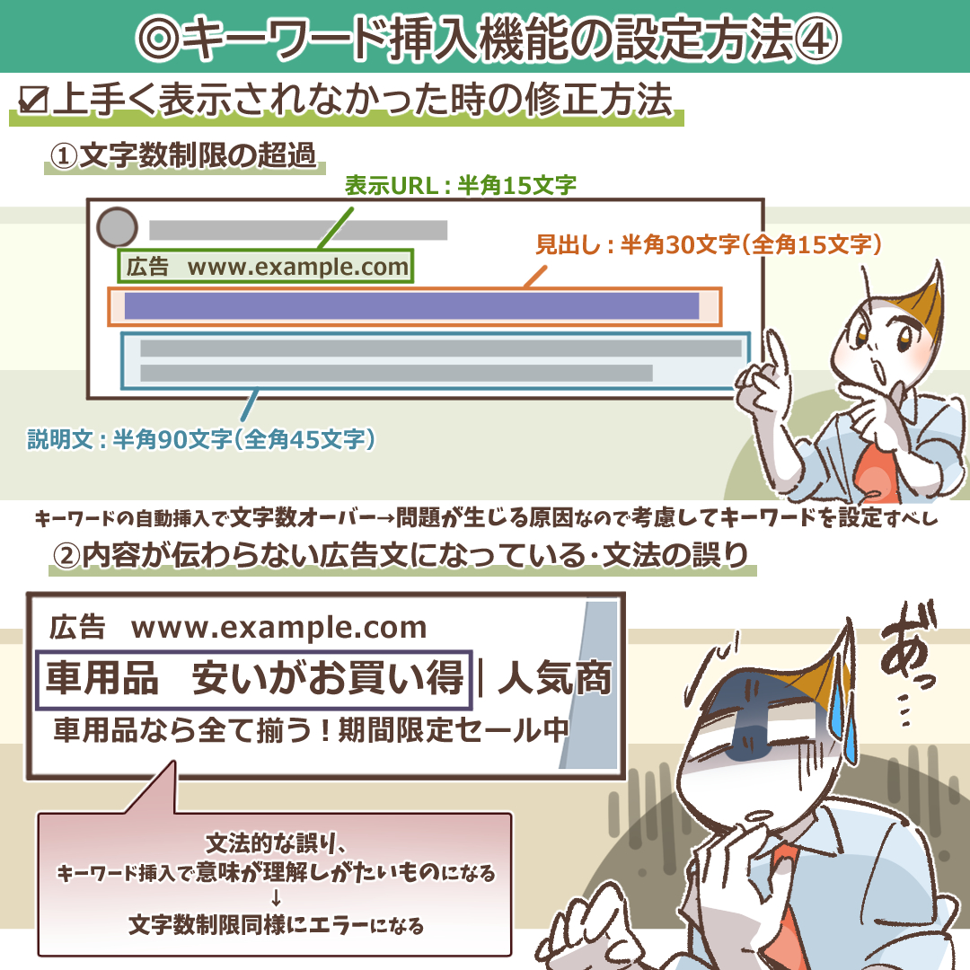 内容が伝わらない広告文になっている(文法の誤り):キーワードを挿入した結果、文法的に破綻している、または意味が全く通じない文章になってしまう場合、GoogleやYahoo!のシステムが品質の低い広告と判断し、キーワードの挿入をブロックすることがあります。