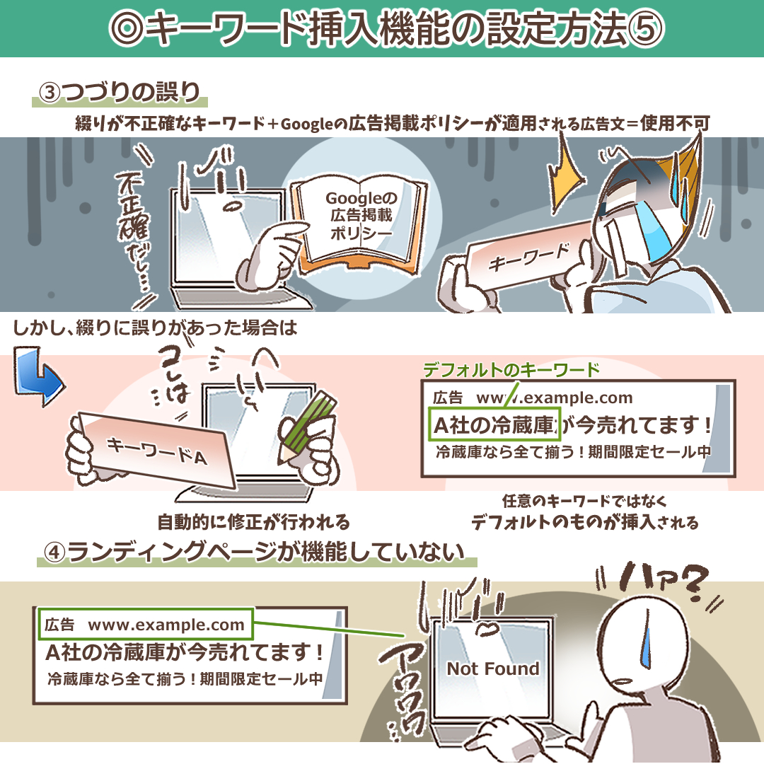 ランディングページが機能していない:広告のリンク先であるランディングページが、リンク切れ(404エラー)やサーバーダウンなどで正常に表示されない場合、広告全体の配信が停止されるため、当然キーワード挿入も機能しません。
