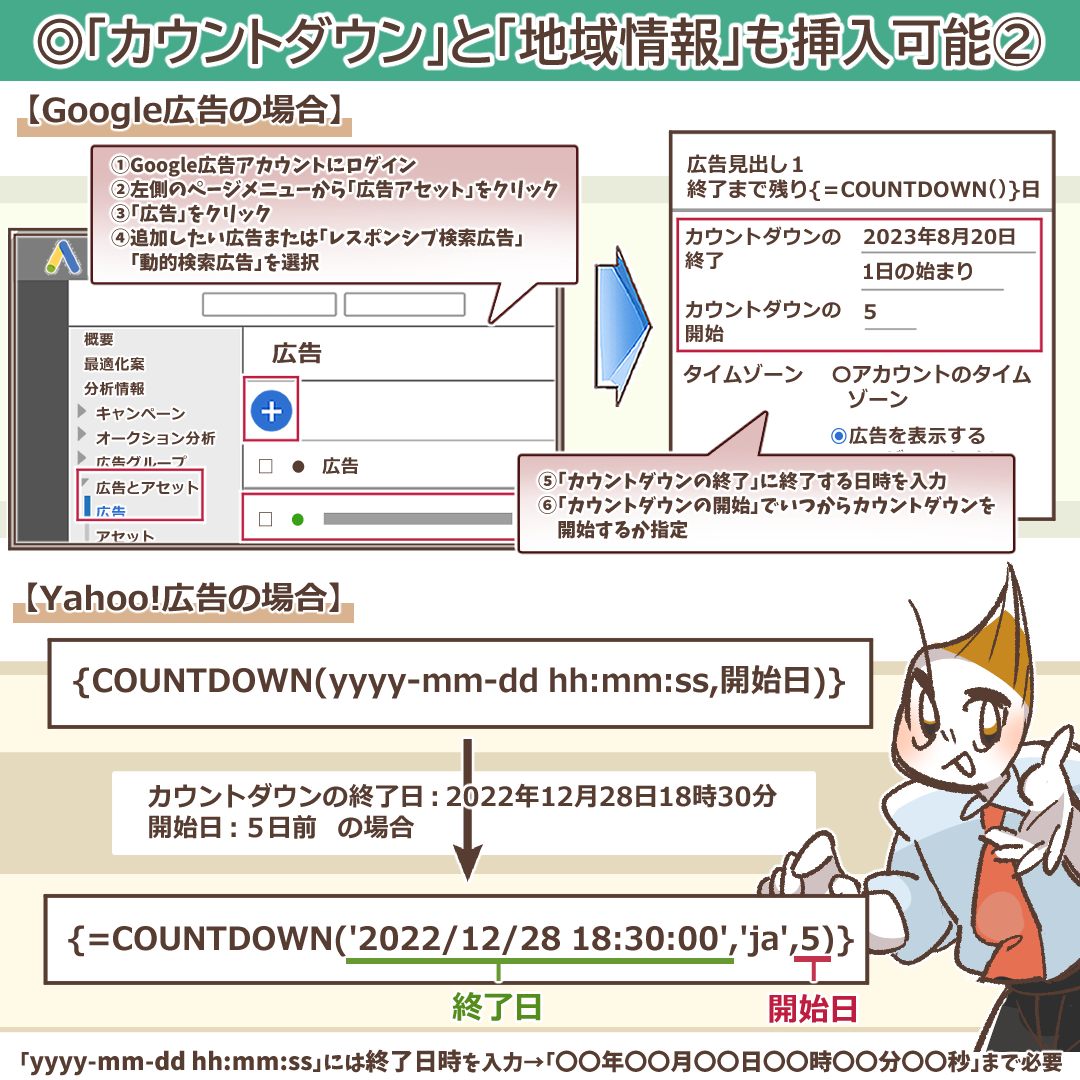 Yahoo!広告では、{COUNTDOWN(yyyy-mm-dd hh:mm:ss,開始日)} という構文を直接入力します。「yyyy-mm-dd hh:mm:ss」に終了日時を、「開始日」に何日前から表示するかを入力します。
