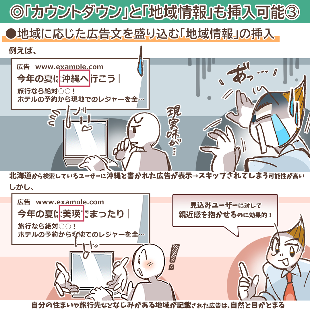 地域に応じた広告文を盛り込む「地域情報」の挿入