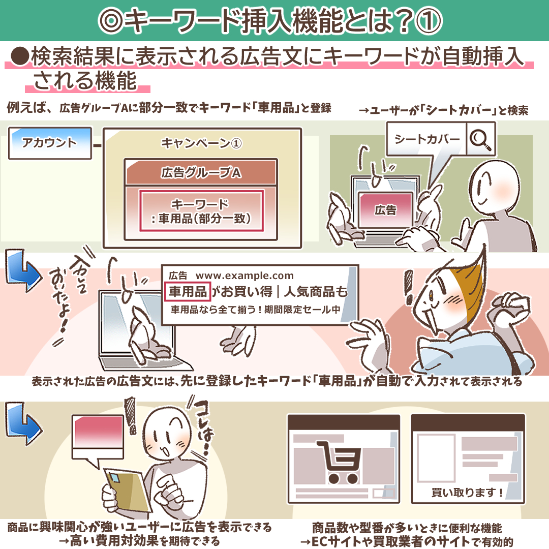 先ほどの例をもう一度考えてみましょう。広告グループに「車用品」というキーワードを登録し、ユーザーが「シートカバー」と検索した場合。広告文に挿入されるのは、ユーザーが入力した「シートカバー」ではなく、あなたが登録した「車用品」です。この機能は、ユーザーの検索ニーズの多様性を、広告主が設定した「車用品」というキーワードの傘の下に集約し、関連性のある広告として表示するためのものです。