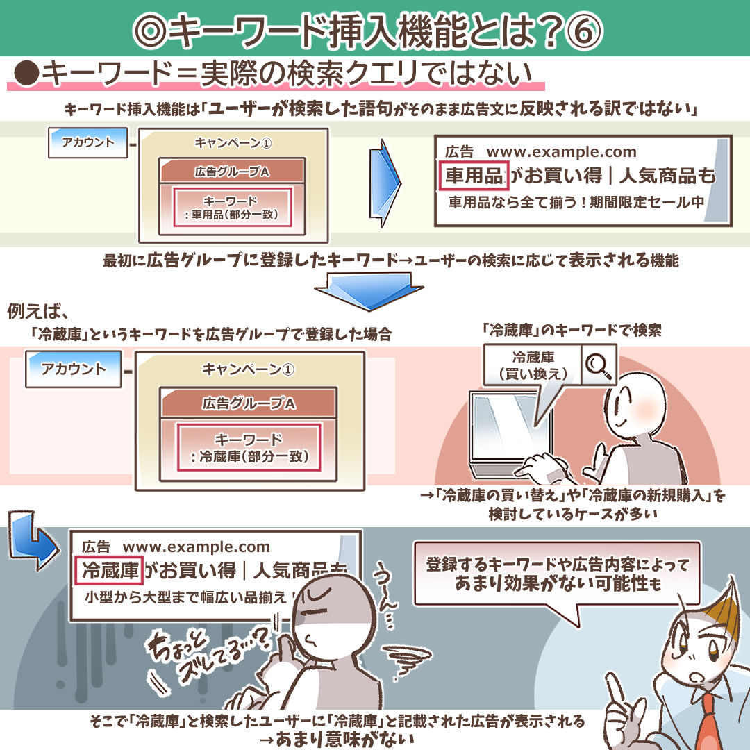 キーワードのマッチタイプとして「部分一致」を利用している場合、広告主が意図しないような、関連性の低い検索語句でも広告が表示されることがあります。この時、キーワード挿入機能は、表示のきっかけとなった検索語句ではなく、広告グループに登録されているキーワードを挿入します。これにより、ユーザーの検索意図と広告文との間に大きな乖離が生まれることがあります。