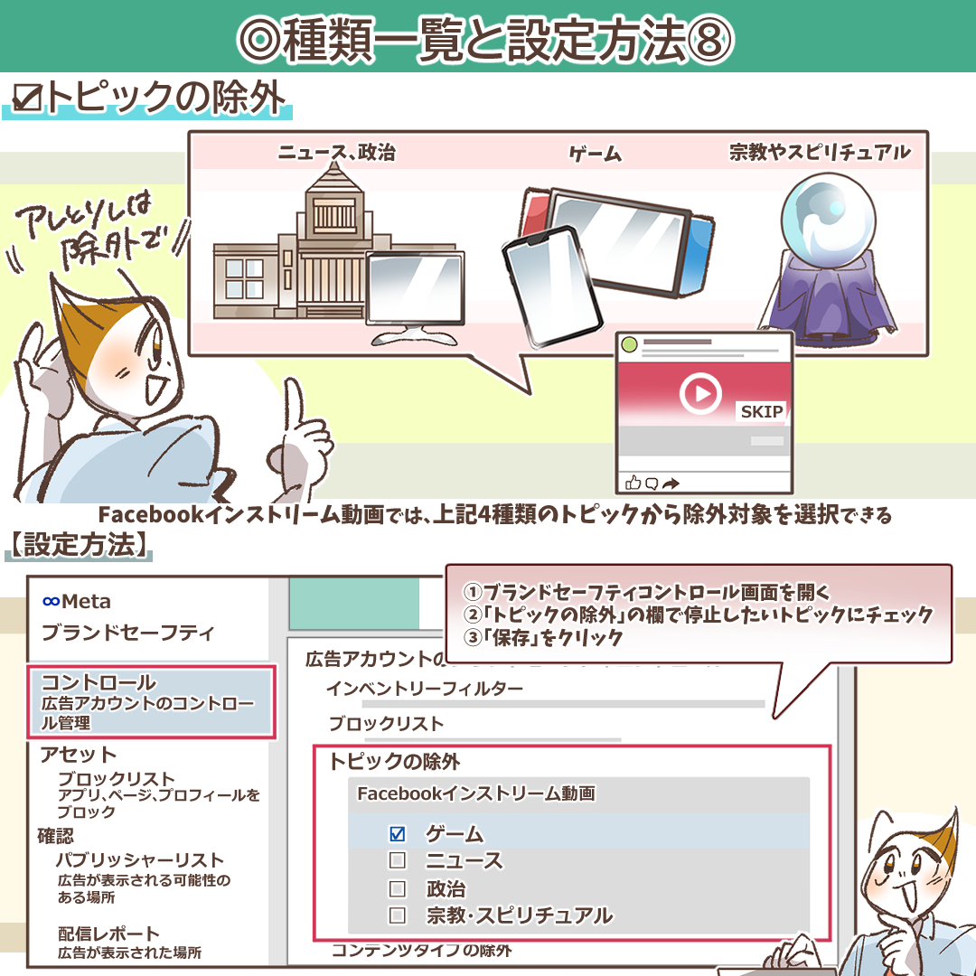 この機能は、Facebookインストリーム動画広告において、特定の「トピック」に関連するコンテンツへの広告表示を除外するものです。現在、除外対象として「ニュース」「政治」「ゲーム」「宗教やスピリチュアル」といった、議論が白熱しやすく、賛否両論が分かれやすい、あるいは特定の思想と結びつきやすいトピックが用意されています。例えば、企業の姿勢として政治的中立を保ちたい場合や、宗教的な文脈で自社の商品が語られることを避けたい場合、これらのトピックを除外設定することで、意図しない文脈でのブランドイメージ毀損リスクを予防できます。自社のブランドが持つ世界観と相性の悪いトピックを事前に排除しておくことは、炎上リスクを低減し、安定した広告運用を行う上で重要な施策です。